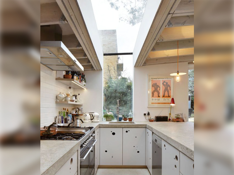 ไอเดียแรกผมจะพาไปดูการนำแสงธรรมชาติมาใช้ในห้องครัวครับ เป็นการเปลี่ยนผนังและฝ้าเพดานตรงกลางห้องครัวให้กลายเป็นกระจกใส ทำให้ในครัวสว่างไสวแทบไม่ต้องใช้หลอดไฟช่วยเลย ช่วยให้บรรยากาศในครัวดูสดชื่นและสบายขึ้น แต่ถ้าจะนำไอเดียนี้มาใช้ในบ้านเราล่ะก็ปล่อยโล่งแบบนี้คงร้อนเกิน ต้องติดฟิล์มกันแดดหรือปลูกต้นไม้ให้ร่มเงาเพิ่มอีกหน่อยก็สวยเลยครับ