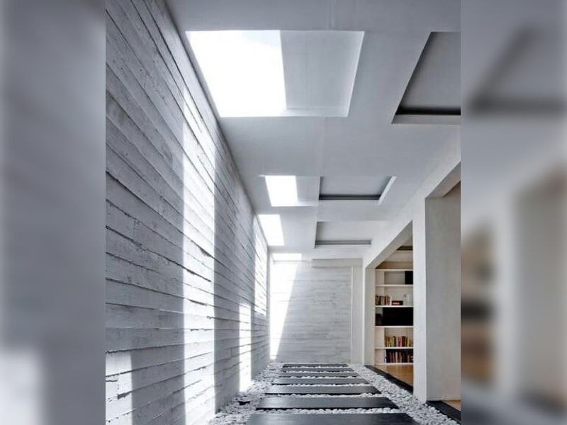 ไอเดียนี้ผมว่าเหมาะกับการนำไปใช้บริเวณทางเดินข้างบ้านมาก ๆ ครับ ในภาพจะเป็นการปิดด้านบนทางเดินด้วยหลังคาแบบทึบตามปกติ แต่จะเพิ่มลูกเล่นด้วยการเจาะรูทรงสี่เหลี่ยมผืนผ้าแบบสุ่มตำแหน่งเป็นระยะ ยาวตลอดแนวทางเดิน ซึ่งพอแสงส่องลงมาก็จะให้ทั้งความสว่างและความสวยงาม เพราะเงาของแสงที่ตกกระทบพื้นจะไม่สม่ำเสมอกัน และเงาจะเปลี่ยนตำแหน่งไปเรื่อย ๆ ตามระยะเวลา เป็นไอเดียทางเดินที่เท่มากครับ