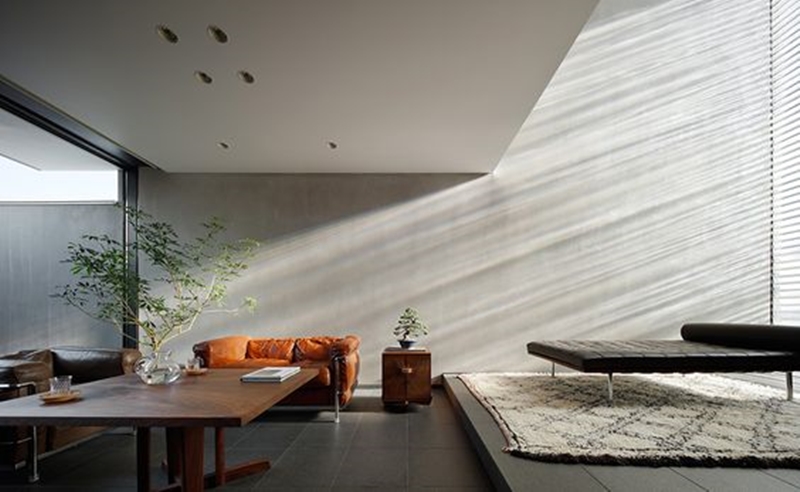 อีกไอเดียหนึ่งจะย้ายจากการรับแสงแดดบริเวณกลางห้องนั่งเล่นมาเป็นรับแสงจากผนังทั้งผืนเลยครับ เหมาะกับบ้านที่มีหลายชั้นไม่สามารถเจาะเพดานได้ ก็รับแสงจากด้านข้างแทน แต่ถ้าเป็นกระจกโล่ง ๆ อาจจะธรรมดาไป เราสามารถเพิ่มลูกเล่นของแสงที่ส่องเข้ามาได้ด้วยมู่ลี่บังสายตา พอแสงส่องผ่านเจ้ามู่ลี่นี้ก็จะเกิดลวดลายสวยงามแบบในภาพเลยครับ เด็ดสุด