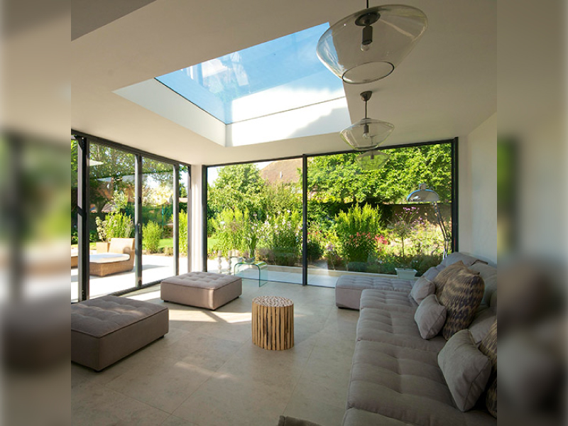 สำหรับห้องนั่งเล่นก็สามารถใช้แสงจากธรรมชาติเพิ่มความโดดเด่นได้เหมือนกันครับ อย่างในภาพนี้จะเป็นการเจาะรูขนาดใหญ่บนเพดานกลางห้องนั่งเล่นเลย ตอนกลางวันก็ว่าสวยแล้วนะ แต่ตอนกลางคืนจะยิ่งสวยกว่านี้อีกเพราะเราจะสามารถนั่งดูดาวและพระจันทร์ตอนกลางคืนได้แบบโล่ง ๆ ไม่มีอะไรกั้น ถ้าอยู่กับแฟนนี่โรแมนติกสุด ๆ เลยล่ะครับ