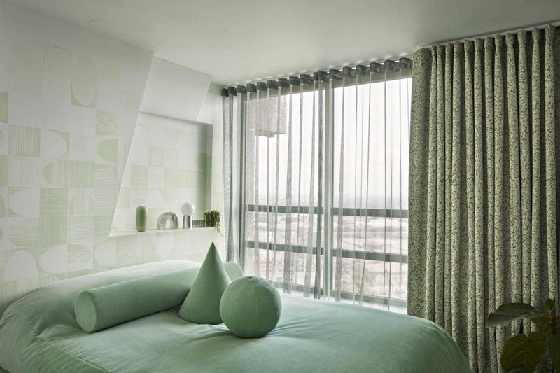อะ เกริ่นมายาวพอแล้ว ผมพาไปดูไอเดียที่เสร็จแล้วเลยดีกว่าจะได้หายงง ห้องแรกเป็นการแต่งห้องนอนโดยใช้ผนังสีเขียวอ่อน ผสมเตียงสีเขียวมิ้นเข้ม และผ้าม่านสีเขียวหม่นคล้ายสาหร่าย จะเห็นได้ว่าเขาใช้สีเขียวหมดเลยแต่สร้างมิติด้วยความเข้ม-อ่อนของสี มีทั้งเขียวอ่อน เขียวเข้ม เขียวหม่น ยังไม่หมดนะครับ ลองสังเกตลายบนวอลเปเปอร์กับหมอนบนเตียงดู เขาใช้เป็นรูปทรงเรขาคณิตหมดเลย แถมยังมีต้นไม้แอบอยู่ปลายเตียงอีก คุมโทนทั้งห้องขนาดนี้ ไม่สวยได้ไงล่ะครับ