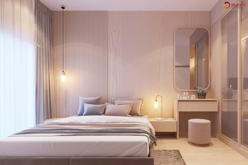ส่วนห้องนี้ไม่ใช่โทนเขียวสดชื่นละ กลายเป็นความอบอุ่นจากไม้แทน แค่เปลี่ยนโทนสีความรู้สึกก็เปลี่ยนหมดเลย อย่างห้องนอนห้องนี้จะเป็นการคุมโทนสีน้ำตาลอ่อนทั้งห้องเลย แต่จะเห็นว่าไม่มีการไล่เฉดสีแล้ว แต่จะเป็นการเพิ่มมิติด้วย Pattern แทน อย่างบนผนังด้านขวาก็ใช้เป็นวอลลายไม้สีอ่อน ๆ นุ่มละมุน ส่วนด้านซ้ายก็ใช้ไม้ระแนงซี่ถี่ ๆ มาตกแต่งเพิ่มลูกเล่น ส่วนมุมแต่งหน้าก็ใช้การไล่ระดับและรูปทรงที่แตกต่าง ซึ่งพอดูภาพรวมแล้วเป็นห้องนอนที่ผมอยากทิ้งตัวมากเลยจริง ๆ