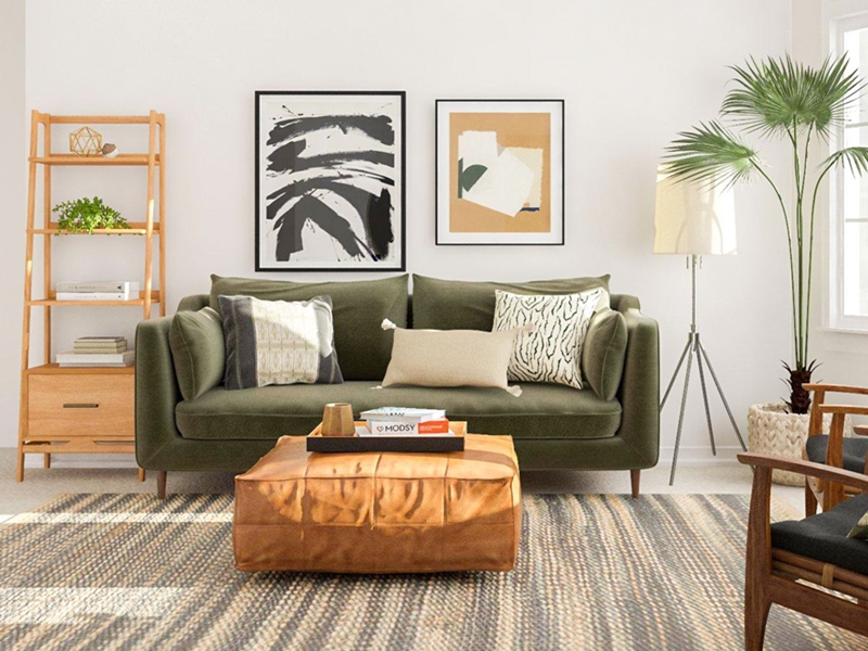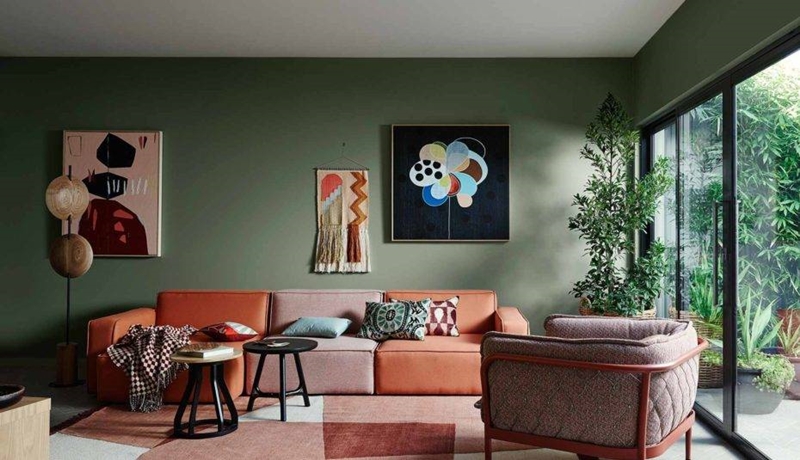 กลับมาที่สีเขียวกันอีกครั้งหนึ่งครับ แต่คราวนี้จะต่างออกไปเพราะเราจะโชว์ไอเดียผสมสีระหว่าง Background สีเขียวเข้มกับ Foreground โทนสีแดง-ส้ม เรียกได้ว่าสีสันจัดจ้านมาก ๆ ผมว่าน่าจะตอบคำถามที่หลายคนกำลังสงสัยและกังวลอยู่ได้ดีเลยแหละว่า Earth Tone เล่นสีได้ไหม ภาพห้องนั่งเล่นดีไซน์เท่ ๆ แบบนี้ช่วยยืนยันได้ดีเลยว่า "ได้ครับ"