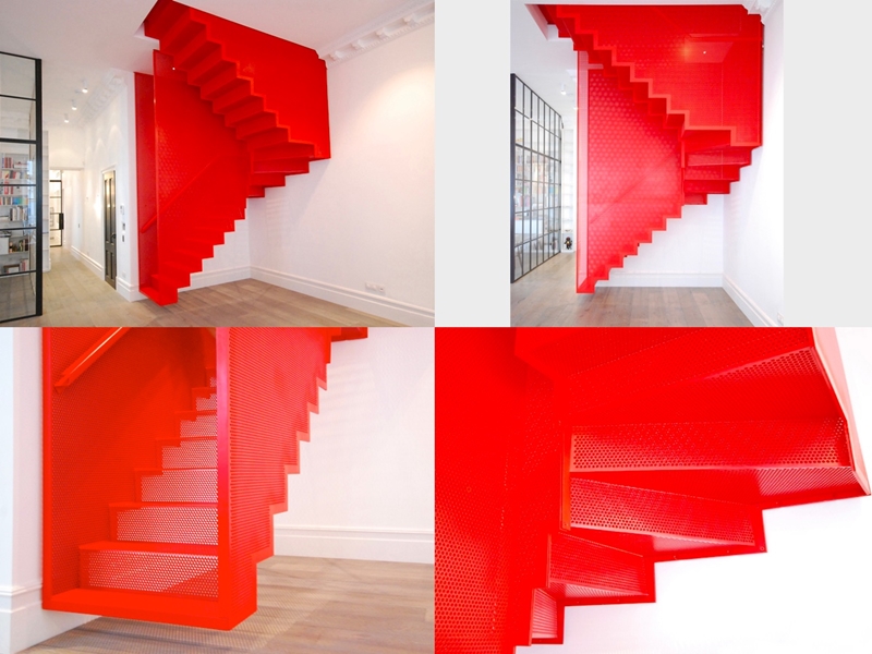 สีแดงนี่มันโดดเด่นและสะดุดตาจริง ๆ ผมยอมรับเลย ไม่ว่าจะเป็นเสื้อสีแดง รถสีแดง หรือบันไดสีแดงก็ตาม ! ไอเดียนี้ยังคง Concept เดิม คือ พื้นที่ด้านล่างเปิดโล่งสามารถใช้ประโยชน์อย่างอื่นได้ ซึ่งตัวโครงสร้างจะเป็นการยึดกับผนังและด้านบนแทนครับ โครงสร้างจะเป็นตะแกรงเหล็กพ่นสีแดง ส่วนลูกนอนใช้เป็นแผ่นเหล็กทึบเพิ่มความแข็งแรงและความสวยงาม ลองสังเกตดี ๆ บันไดไม่ติดพื้นด้วยนะครับ ลอยขึ้นมาเสต็ปนึง ดูเท่ขึ้นเยอะเลย