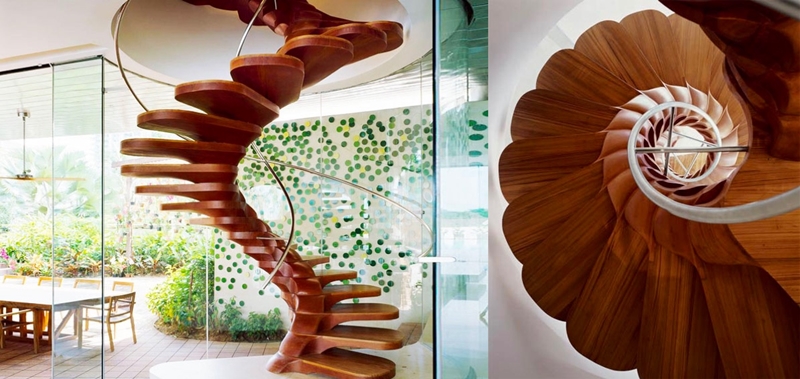 สำหรับใครที่ความสวยมาก่อนต้องลองนี่เลยครับ บันไดเวียนรูปดอกไม้ ... เห็นด้านข้างบางคนอาจสงสัยว่ามันดอกไม้ยังไงเนี่ย ? งั้นลองดูด้านขวาที่เป็นมุมมองจากด้านบนลงล่างแล้วจะรู้ครับ สวยมากกกกกกก ส่วนประกอบหลักจะเป็นบันไดเวียนที่ทำจากไม้สีเข้มเคลือบเงาครับ ติดราวจับกันตกไว้ทั้ง 2 ด้านเพื่อความปลอดภัย ง่าย ๆ แค่นี้แหละครับ แต่สวยและแพงมากเชียวแหละแบบนี้
