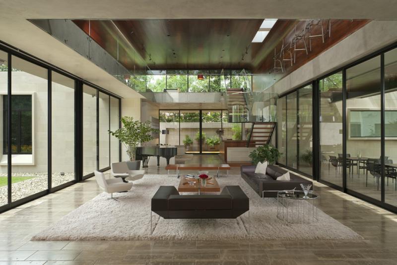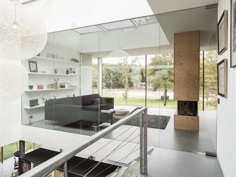 ไอเดียแรกมาแบบเรียบหรูกันก่อนเลยครับ เป็นห้องนั่งเล่นสไตล์โมเดิร์นที่ผนังทุกด้านเป็นกระจกหมดเลย ทั้งด้านที่เชื่อมต่อไปสู่ห้องอื่นในบ้านและด้านที่เป็นผนังนอกบ้าน ช่วยให้ห้องนั่งเล่นดูโล่งขึ้น เชื่อมต่อกับส่วนอื่นรอบข้าง ประกอบกับเป็นห้องนั่งเล่นเพดานสูง Double Volume ด้วย ยิ่งช่วยให้ห้องดูโปร่งขึ้นไปอีกครับ ไอเดียนี้ผมว่าเหมาะกับคนที่ชอบสไตล์โมเดิร์นผสมเลยล่ะครับ