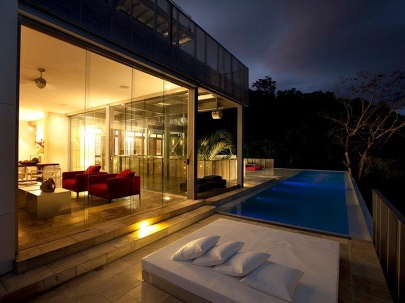 บ้านใครใหญ่หน่อยและมีสระน้ำส่วนตัว ลองไอเดียนี้ดูก็น่าสนใจไม่น้อยเลยนะครับ เป็นการทำห้องนั่งเล่นผนังกระจกที่อยู่ติดกับทางลงสระไปเลย แน่นอนว่าเล่นใหญ่เบอร์นี้ก็ต้องตกแต่งสไตล์ Luxury เลย พื้นปูกระเบื้องลายหินอ่อน ประดับด้วยไฟหลืบสีเหลืองนวลเพิ่มความหรูหราดูแพง บรรยากาศที่ได้ก็จะประมาณนี้เลยครับ ไม่ต้องออกไปเที่ยวไหนแล้วแบบนี้ นั่งมองได้ทุกวันไม่มีเบื่อ