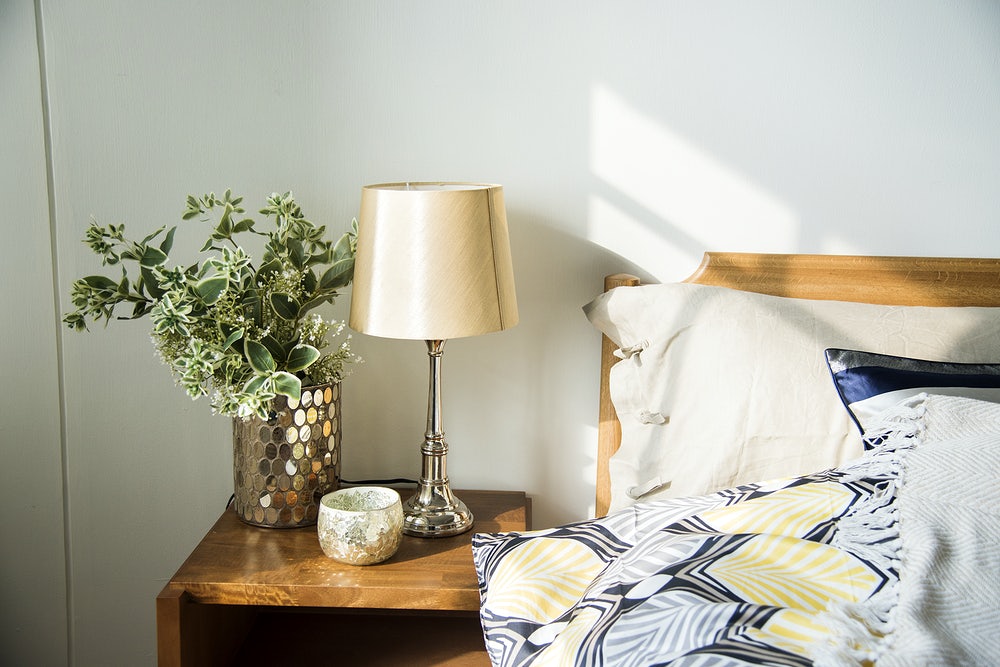 เลือกโต๊ะข้างเตียงแบบให้เข้าธีมประกบซ้ายขวา โดยที่ไม่จำเป็นต้องเลือกซื้อแบบมีลิ้นชักก็ได้ และไม่ควรวางของเยอะจนรกเกินไป ไว้วางแค่โทรศัพท์ซะเครื่องหรือวางโคมไฟ ไม่ก็กรอบรูปต้นไม้ก็เพียงพอแล้ว ควรให้โต๊ะข้างเตียงดูเรียบง่ายเป็นระเบียบจะดีที่สุด