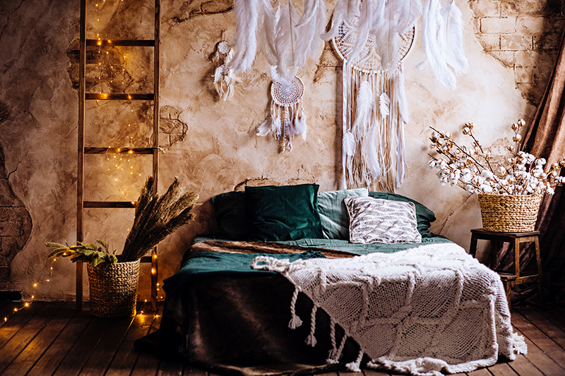 ปกติถ้าเป็นห้องในสไตล์อื่นๆ เรามักจะแนะนำให้ทาสีผนังไม่ก็ติดวอลเปเปอร์ แต่ถ้าเป็นแนวโบฮีเมียน ไม่ต้องยุ่งยากวุ่นวายเลย แค่เลือกซื้อผ้าหรือพรมแขวนผนังขนาดใหญ่ ที่เป็นลายโบโฮ ลายชนเผ่า มีความเป็นลวดลายสีสันสวยงามแปลกตา ซึ่งขึงผ้ากับผนังแค่ฝั่งเดียวก็แจ่มว้าวแล้ว หรือวันไหนเกิดเบื่อลายนี้ก็หาผ้าเปลี่ยนลายใหม่ได้ง่ายดาย