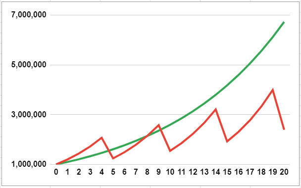 ใช่ครับ ! คำตอบอยู่ในรูปที่คุณเห็นตั้งแต่ต้นของบทความนี้แล้ว !เส้นสีเขียวคือเส้นทางความมั่งคั่งของอ่อน ในขณะที่ เส้นสีแดงคือเส้นทางของเจ๋ง (ตลอดระยะเวลา 20 ปี)