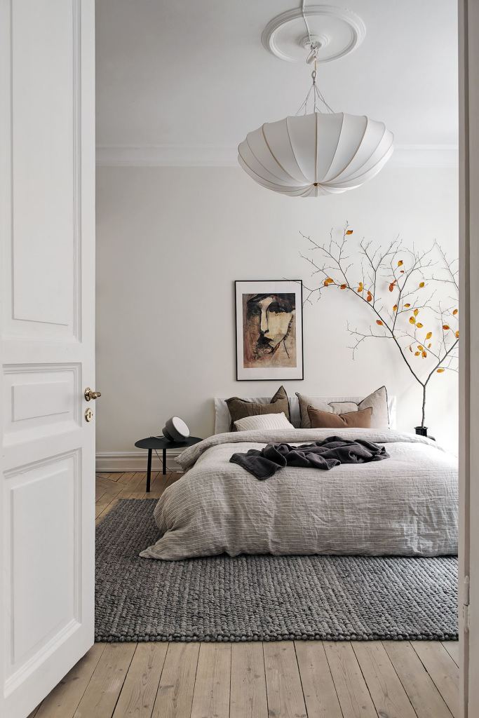 ถ้ารู้สึกว่าวางที่นอนกับพื้นเลยและรู้สึกไม่ชิน ลองเลือกพรมนุ่มๆ มาวางสักผืน หรือจะเป็นพรมแบบถักโทนสีน้ำตาลก็ได้เหมือนกัน ซึ่งการวางพรมนั้นมีทั้งแบบวางที่นอนทับพรมไปเลย โดยเหลือพื้นที่ว่างของพรมไว้สองฝั่ง ถ้าวางที่นอนชิดกำแพง หรือเหลือพื้นที่ทั้งสามฝั่งสำหรับวางที่นอนไว้กลางห้อง ขึ้นอยู่กับการจัดที่นอน หรือจะเลือกวางชิดกับขอบที่นอนไม่ตรงปลายก็ด้านข้างของที่นอน แม้แต่วางที่นอนทับพรมครึ่งหนึ่ง ก็จะให้ฟีลที่ทำให้ห้องรู้สึกอบอุ่นมีความโคซี่แตกต่างกันไป
