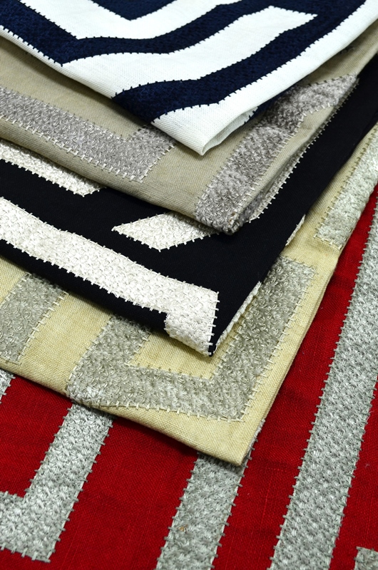 ลายปักเงาแวววาวตัดกับพื้นผ้าลินินลายนี้ ได้รับแรงบันดาลใจมาจากลวดลายที่ปรากฏให้เห็นอยู่เสมอในเครื่องแต่งกายในยุคศตวรรษที่ 18 ที่ถูกนำมาใช้เป็นโครงอย่างคร่าวๆ โดยเฉดสีทั้งสามพร้อมช่วยเพิ่มเสน่ห์ชวนมองให้กับการตกแต่งของทุกห้อง และรูปแบบที่เป็นลายทางยังเอื้อให้ผู้ชมเกิดจินตนาการได้มากมาย เช่น แต่งขอบ (Leading Edge) ของผ้าม่านด้วยแถบขนาดกว้างที่เย็บขึ้นด้วยผ้าดามาสก์ลาย GINI ของ No.9 Thompson เป็นต้น