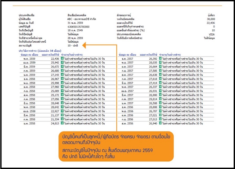 อีกหนึ่งข้อมูลที่เก็บคือ เกี่ยวกับสินเชื่อ ไม่ว่าจะเป็นการขอ การอนุมัติ หรือแม้แต่การชำระ ทั้งในเรื่องของที่อยู่อาศัย เงินสด รถ บัตรเครดิต ค้ำประกัน ซื้อขายหลักทรัพย์ แต่จะเป็นในส่วนของหนี้สินเท่านั้น รวมหมดทั้งหนี้ที่ดีและไม่ดี โดยเค้าจะมีบอกว่าเราชำระตรงหรือไม่ตรงกำหนดไหม ค้างชำระรึเปล่า อย่างไรก็ตามข้อมูลที่ว่ามาถ้าเป็นรายบุคคล จะแสดงย้อนหลังได้ 3 ปี