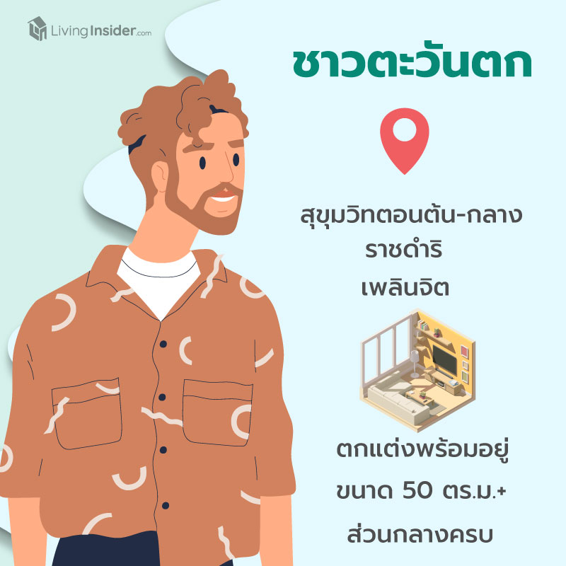 ซึ่งคนกลุ่มนี้จะให้ความสำคัญกับทำเลเป็นหลัก อย่าลืมว่าคนกลุ่มนี้ไม่ใช่ดูแค่เรื่องการเดินทางใกล้กับที่ทำงาน แต่ยังให้ความสำคัญกับสังคมรอบๆ รวมทั้งสิ่งอำนวยความสะดวกครอบครัวของพวกเขาด้วย เช่น โรงเรียนนานาชาติ ไว้รองรับลูกๆ ของพวกเขา ฯลฯ ซึ่งคนกลุ่มนี้จะดูขนาดของห้องไม่ควรต่ำกว่า 50 ตร.ม. รวมถึงจะยอมจ่ายค่าเช่าเฉลี่ยอยู่ที่ 20,000+ บาท/ เดือน สำหรับ 1 ห้องนอน และ 40,000+ บาท / เดือน สำหรับ 2 ห้องนอน