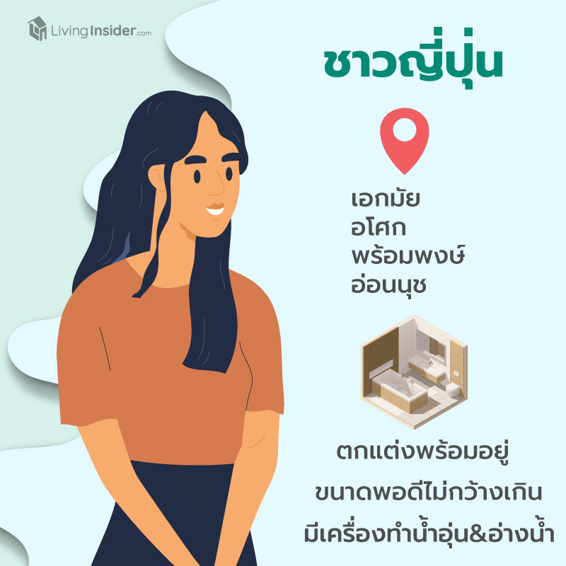 พฤติกรรมการเลือกที่อยู่อาศัยของชาวญี่ปุ่นเมื่อมาต่างแดนพวกเขาจะเลือกอยู่เป็นชุมชน เลือกทำเลที่มีคนชนชาติเดียวกันอยู่อาศัยกันแน่นอนว่าทำเลสุดฮิตของคนญี่ปุ่นก็คงหนีไม่พ้น สุขุมวิทตอนกลางในช่วงเอกมัย ถึงอโศก ซึ่งทำเลเหล่านี้ค่อนข้างมีความหลากหลายทางสัญชาติพอสมควร แต่ชาวญี่ปุ่นเริ่มมีการขยับขยายไปถึงย่านพระโขนง-อ่อนนุช กันให้เห็นบ้าง