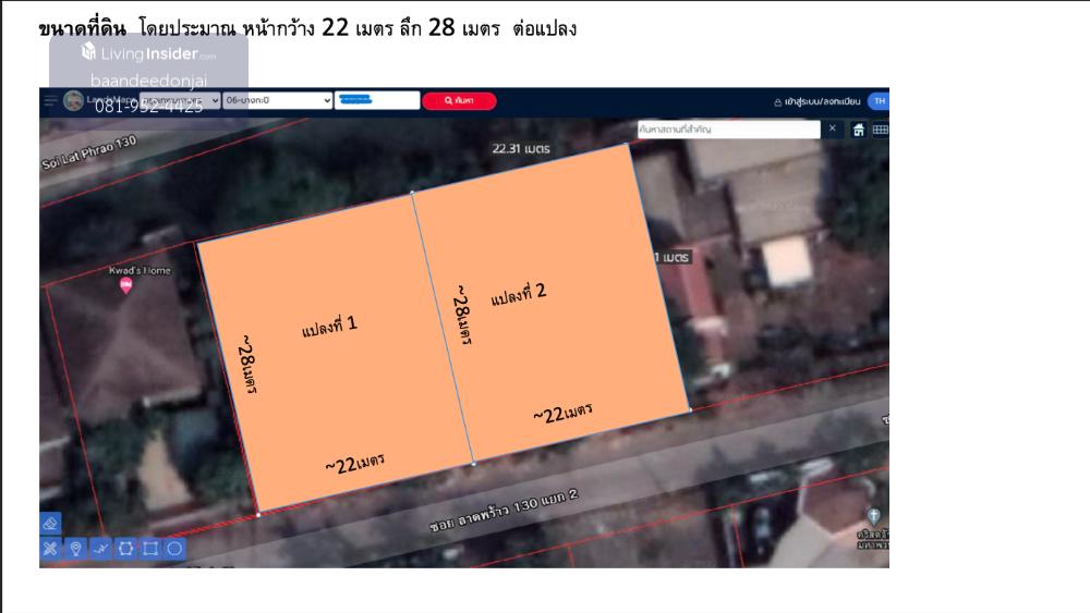 ขายด่วน ที่ดินถมแล้ว 324 ตร.ว. ซ.ลาดพร้าว 130 แยก 2 ห่างถนนใหญ่เพียงแค่ 550 เมตร ใกล้รถไฟฟ้าสถานี ลาดพร้าว 101 สายสีเหลือง/สายสีส้มรามคำแหง แบ่งขายแปลงละ 162 ตร.ว. ราคา 22.7 ล้านบาท (จากเดิม 25.1 ล้านบาท) ตกแปลงละ (~ 140,000 บาท/ตร.ว.) พิเศษ!!!! ซื้อ 2 แปลง เหลือ 43.7 ล้านบาท ( จากเดิม 48.6 ล้านบาท) ตกแปลงละ (~ 135,000 บาท/ตร.ว.) เหมาะจะสร้างบ้านพักหรือ ทำเป็นทาวเฮาส์ อพาร์ทเมนต์ให้เช่าก็คุ้มสุดๆ รายละเอียด - ที่ดินแปลงละ 162 ตร.ว. มี 2 แปลง รวม 324 ตร.ว. - หน้าที่ดินกว้าง ~22 เมตร ลึก ~28 เมตร ต่อแปลง ถ้าซื้อสองแปลงกลายเป็นสี่เหลี่ยมผืนผ้าหน้ากว้างสวยสุดๆ - ด้านหน้าเป็นถนนคอนกรีต 5 เมตร ยกแล้ว น้ำไม่ท่วม - ด้านหน้าหันทิศ ตะวันออกเฉียงใต้ รับลมดีตลอดปี จุดเด่น - ซอย ทะลุออกได้ทั้ง ลาดพร้าว 130 และรามคำแหง 81 - มีทั้งรถไฟฟ้าสายสีเหลือง ลาดพร้าว และสายสีส้ม รามคำแหง กำลังจะเสร็จ รีบตัดสินใจก่อนราคาจะขึ้นไปอีก - สถานที่ใกล้เคียง สถานที่สำคัญใกล้เคียงต่างๆ เช่น โรงพยาบาลเวชธานี 800 ม. ตะวันนา 2 OfficeMate ประมาณ 1 กม. Makro ประมาณ 1 กม. ตะวันนา 1.2 กม. เดอะมอลล์ บางกะปิ 1.3 กม. แฮปปี้ แลนด์ เซ็นเตอร์ ประมาณ 1.6 กม. รพ.รามคำแหง ประมาณ 1.6 กม. รพ.ลาดพร้าว ประมาณ 1.8 กม. Tesco Lotus บางกะปิ 1.9 กม. ตลาดบางกะปิ ประมาณ 2.0 กม. พันธุ์ทิพย์ พลาซ่า บางกะปิ ประมาณ 2.0 กม. FoodLand ประมาณ 2.0 กม. การกีฬาแห่งประเทศไทย กกท 2.3 กม. บิ๊กซี ลาดพร้าว ประมาณ 2.8 กม. มหาวิทยาลัยรามคำแหง ประมาณ 2.8 กม. ทางด่วนรามอินทรา – อาจณรงค์ ประมาณ 3.1 กม. รหัสทรัพย์ LDJ-005 +-+-+-+-+-+-+-+-+-+-+ สนใจติดต่อ / Contact ทาง LineID : @baandeedonjai หรือคลิกที่นี่: https://lin.ee/qj6jzs0 ภัทรพล (กล้า) โทร : คลิกเพื่อดูเบอร์โทรติดต่อ สามารถติดตามผลงานของเรา ผ่านช่องทาง Facebook Page : baandeedonjai - https://shorturl.asia/irxZk Youtube : baandeedonjai - https://shorturl.asia/OVpZ Tiktok : @baandeedonjai - https://shorturl.asia/f1DVQ #บ้านดีโดนใจ #ขายที่ดินทําเลดี #ขายที่ดินราคาถูก #ลาดพร้าว #ลาดพร้าว130 #ลาดพร้าว101 #บางกะปิ #รามคำแหง #รามคำแหง81 #หัวหมาก #กกท #โรงพยาบาล #เวชธานี #ตะวันนา #OfficeMate #เดอะมอลล์บางกะปิ #แฮปปี้แลนด์ #โรงพยาบาลรามคำแหง #โรงพยาบาลลาดพร้าว #ตลาดบางกะปิ #พันธุ์ทิพย์บางกะปิ #การกีฬาแห่งประเทศไทย #มหาวิทยาลัยรามคำแหง