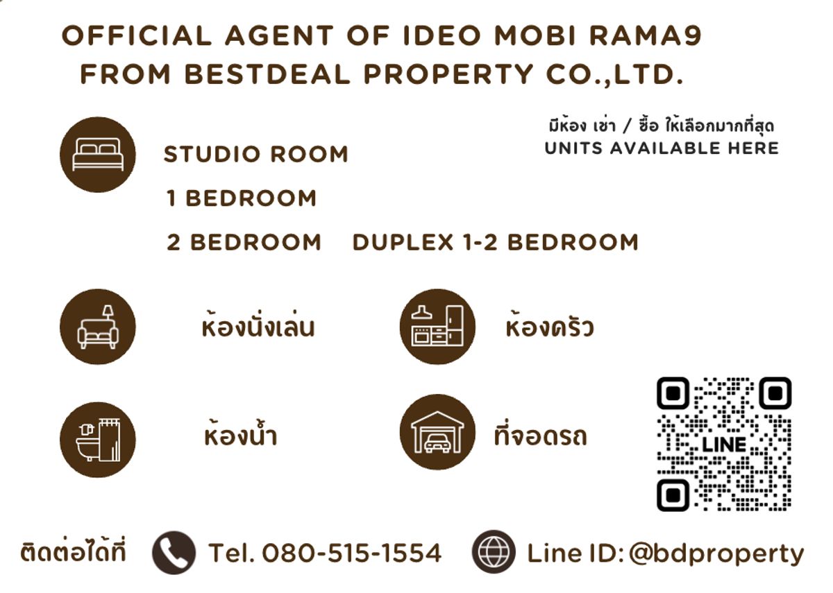 แบบห้อง Duplex 2ห้องนอน 2 ห้องน้ำ 1 ห้องรับแขก 62 ตร.ม. Fully furnished. (ภาพถ่ายจากห้องจริง เฟอร์นิเจอร์และเครื่องใช้ไฟฟ้าตามรูปภาพ) ราคาพิเศษ. 7,590,000 ล้านเท่านั้น ราคารวมทุกค่าใช้จ่าย (ยกเว้นค่าจดจำนองในกรณีลูกค้ากู้แบงค์) >>พร้อมให้ข้อมูลและคำปรึกษาด้านสินเชื่อ<< มีห้องสำหรับซื้อและเช่าทุกแบบให้เลือกในตำแหน่งและราคาที่ดีที่สุด Official Agent of Ideo Mobi Rama9 (Question / Appointment) เอเจนท์ประจำโครงการ สนใจชมห้อง กรุณานัดล่วงหน้า Tel: คลิกเพื่อดูเบอร์โทรติดต่อ Line ID : bdproperty >>ไม่อนุญาตให้นํารูปไปใช้ทุกกรณี<<
