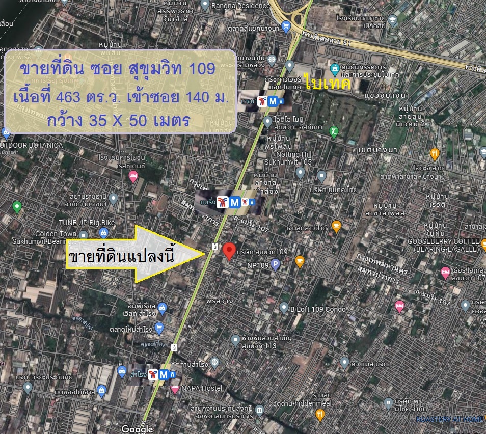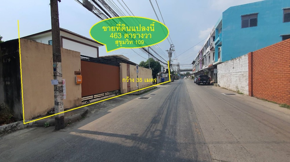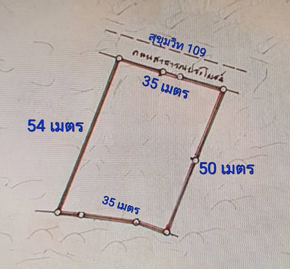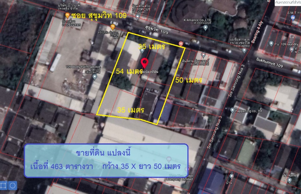 ขาย ที่ดินเปล่า 1 ไร่ 63 ตารางวา ซอย สุขุมวิท 109 หน้ากว้าง 35 เมตร ลึก 50 เมตร ทำเลดี เดินทางสะดวก เข้าซอยเพียง 140 เมตร รายละเอียดที่ดิน : - หน้ากว้าง 35 เมตร ลึก 50 เมตร - ถนนซอย กว้าง 8 เมตร - ใกล