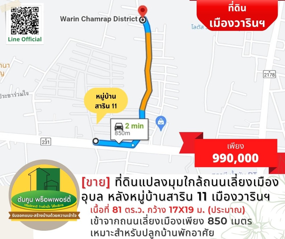 [ขาย] ที่ดินแปลงมุมใกล้ถนนเลี่ยงเมืองอุบล ขนาด 81 ตร.ว. หลังหมู่บ้านสาริน 11 เมืองวารินฯ [รหัส TK-1944-B251] จุดเด่น: 📣 ใกล้ถนนเลี่ยงเมือง น้ำไม่ท่วม เดินทางสะดวก ✅ โฉนดเนื้อที่ 81 ตร.ว. หน้ากว้าง 17X19 เมตร (โดยประมาณ) ✅ ที่ดินแปลงหัวมุม ติดถนนสองฝั่ง ถนนคอนกรีต มีเพื่อนบ้าน ✅ แปลงที่ดินอยู่หลังหมู่บ้านสาริน 11 เข้าจากถนนเลี่ยงเมืองเพียง 850 เมตร ✅ สิ่งแวดล้อมดี ไม่แออัด น้ำ-ไฟฟ้าพร้อม เหมาะสำหรับปลูกบ้านพักอาศัย 🎯 พิกัด: https://goo.gl/maps/BPojd7rHDJzeVe8A6 สถานที่ใกล้เคียง: สาริน 11 (850 เมตร), โลตัสวารินฯ (2.1 กิโลเมตร), ตลาดเจริญศรี (4.5 กิโลเมตร) ขายเพียง 990,000 บาท (ค่าใช้จ่ายในการโอนกรรมสิทธิ์คนละครึ่ง) 📢 สนใจนัดดูบ้าน/ที่ดิน ทักแชทได้ที่ Line Official: http://line.me/R/ti/p/@rjg7947j -------------------------------- หรือติดต่อสอบถามเพิ่มเติม ☎️: คลิกเพื่อดูเบอร์โทรติดต่อ (เชษฐ์ ต้นคูน) Line: @ubonproperty ☎️: คลิกเพื่อดูเบอร์โทรติดต่อ (ต้นคูน) -------------------------------- ติดตามทรัพย์เพิ่มเติมทางเพจ https://www.facebook.com/UbonRatchathaniProperty #ต้นคูนพร็อพเพอร์ตี้ ฝากขาย ฝากเช่า ขายฝาก ขายบ้าน/ที่ดินในอุบลราชธานี #นายหน้าอุบล #รับสร้างบ้าน #บ้านอุบล #ที่ดินอุบล #บ้านวาริน #ที่ดินวาริน #บ้านพร้อมสร้าง #ราคาไม่แพง