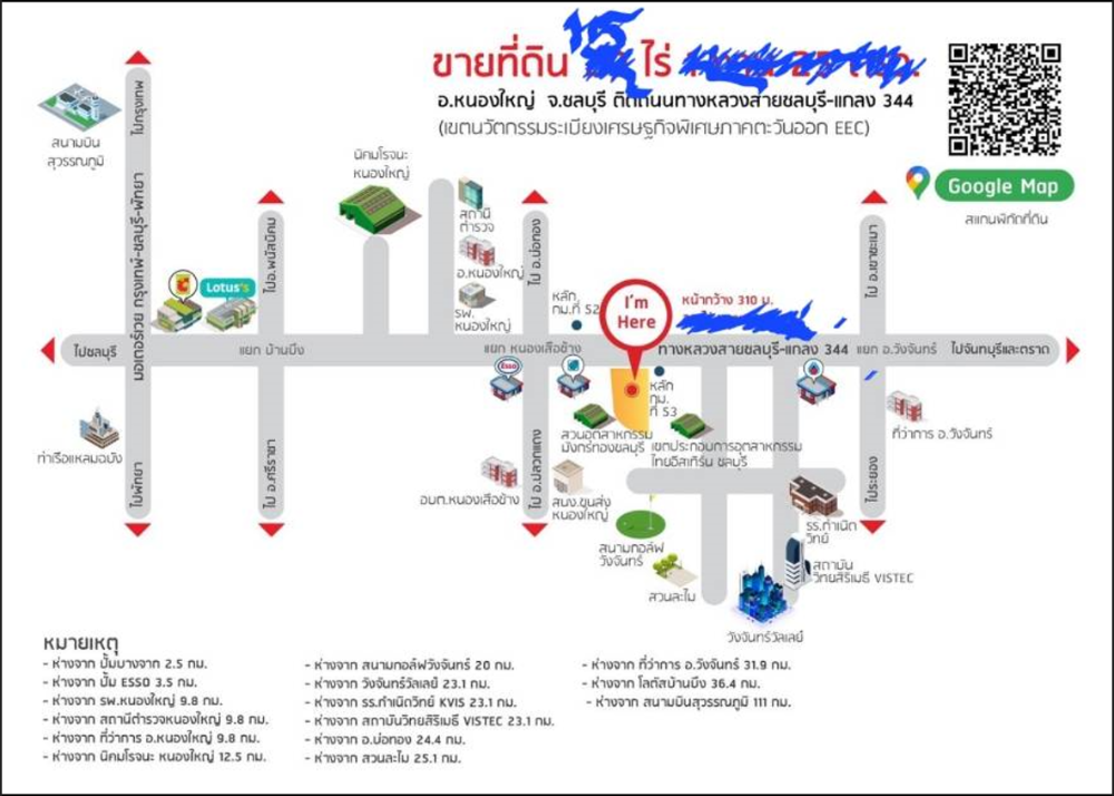ขายที่ดินเปล่า 15 ไร่ อำเภอ หนองใหญ่ จังหวัดชลบุรี ติดถนน หน้ากว้าง 118 เมตร ลึก 268 เมตร จุดเด่น: 1. ที่ดินเป็นโฉนดครุฑแดงมีถนนสาธารนะล้อมข้าง ด้านหน้าติดถนนด้านหลังติดภูเขาลูกเล็กๆ 2. ที่ดินอยู่ในเขต EEC ทำอุตสาหกรรมได้ 3. ฮ้วงจุ้ยดี รูปแปลงที่ดินสวย ราคาไร่ละ 3.9 ล้านรวม 58.5 ล้าน (ค่าโอน+ภาษี+อากรแสตมป์) ผู้ซื้อผู้ขายออกคนละครึ่ง Land for sale, 15 rai, Nong Yai District, Chonburi Province. Front part of the land is next to the main road while the back part is connected to the mountain. The plot has a width of 118 meters and depth of 268 meters. The land is a Red Garuda deed, with public road surrounding the plot. The land is located in the EEC area for industrial use. The sale price is 3.9 million baht per rai, totalling 58.5 million baht; transfer fees + tax + stamp duty to be split evenly between buyers and sellers. 待售空地,春武里府 Nong Yai 区 15 rai,紧邻道路,宽 118 米,深 268 米。 强调: 1. 该土地是红鹰航地契,周围有公共道路。前面挨着路,后面挨着一座小山。 2. 该土地位于EEC地区,可用于工业。 3.风水好,地块形象优美。 售价390万每莱,总计5850万(转让费+税+印花税),买卖双方各付一半。