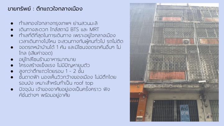 ทําเลทอง ใจกลางกรุงเทพ (ชั้นดาดฟ้า มองเห็นวิวกว้างของเมือง) ไม่มีตึกโดยรอบบัง 43/5 ซ.เฉลิมเขตน์ 2 แขวงวัดเทพศิรินทร์ เขตป้อมปราบฯ กทม พื้นที่ที่ดิน: 14 ตร.ว. พื้นที่ใช้สอย: 250 ตร.ม. หน้ากว้าง: 4 เมตร ตึกลึก: 11 เมตร เพดานสูงมาก จํานวนชั้น: 5 ชั้น + 1 ดาดฟ้า (ตึกรอบๆ สูง 4 ชั้น) รายละเอียดห้อง - 4 ห้องนอน - 3 ห้องน้ํา - 1 ห้องทํางาน - 5 ห้องโถง - 1 ครัว - 2 ดาดฟ้า - 3 ชานบ้านเล็ก (ชั้น 2 - 4) - ทําเลทองใจกลางกรุงเทพฯ ย่านสวนมะลิ - เดินทางสะดวก ใกล้สถานี BTS และ MRT (ทําเลที่ดีที่สุดในการเดินทาง เพราะอยู่ใจกลางเมือง เวลาเดินทางไปไหน จะสวนทางกับผู้คนทั่วไป รถไม่ติด) - จอดรถหน้าบ้านได้ 1 คัน และมีโซนจอดรถคันอื่นๆ ไม่ ไกล (เสียค่าจอด) - อยู่ใกล้โซนร้านอาหารมากมาย - โครงสร้างแข็งแรง ไม่มีปัญหายุบตัว สูงกว่าตึกแถวโดยรอบ 1 - 2 ชั้น (ชั้นดาดฟ้า มองเห็นวิวกว้างของเมือง) - ไม่มีตึกโดยรอบบัง เหมาะสําหรับทําเป็น roof top - ปัจจุบันเจ้าของอาศัยอยู่เองเป็นครั้งคราว - ฟังค์ชั่นต่างๆ พร้อมอยู่อาศัย สถานะการขาย - ขายเพราะจะปลูกบ้านใหม่ในโซนชาน เมือง ไม่ได้เร่งขายแต่อย่างใด บ้านหลังอื่นในโซนนี้ ขายแพงกว่า ในขณะที่พื้นที่ใช้สอยน้อยกว่า ติดต่อ ไอซ์ โทร. คลิกเพื่อดูเบอร์โทรติดต่อ คลิกเพื่อดูอีเมล