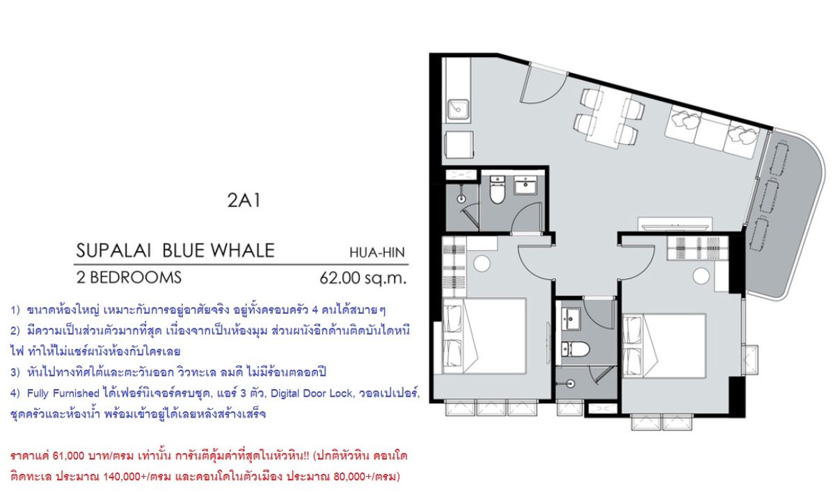 [เจ้าของขายเอง] ด่วน ขายดาวน์เท่าทุน!! ก่อนโอนกรรมสิทธิ์ภายในเดือน 7 ปีนี้ เนื่องจากเจ้าของย้ายไปทำงานต่างประเทศ ขายดาวน์คอนโด Supalai Blue Whale Huahin ห้อง 07-15 ชั้น 7 ห้องแบบ 2 ห้องนอน 2 ห้องน้ำ พื้นที่ 62 ตรม. วิวทะเลและภูเขา ราคารอบแรกสุด ถูกที่สุด ***ห้องนี้เข้าร่วม investment program โดยทางศุภาลัยจะเอาห้องไปปล่อยเช่าระยะยาวให้ การันตีผลตอบแทนค่าเช่า 6%/ปี ของราคาหน้าสัญญาสุทธิ จำนวน 3ปี แต่หากเจ้าของห้องไม่อยากเข้าร่วม investment program เช่น อยากใช้ห้องพักเพื่ออยู่อาศัยเอง หรืออยากเอาไปปล่อยเช่าเอง ก็สามารถทำได้ครับ แจ้งโครงการตอนทำเรื่องเปลี่ยนชื่อได้เลย*** ข้อมูลห้อง - เลขที่ห้อง 07-15 ชั้น 7 หน้าต่างทิศใต้และตะวันออก ลมดีตลอดปี. วิวทะเลและภูเขา สวยสุดๆ - ห้องมุม แบบ 2 ห้องนอน 2 ห้องน้ำ พื้นที่รวม 62 ตรม. มีความเป็นส่วนตัวที่สุด เนื่องจากผนังข้างนึงติดบันไดหนีไฟ ทำให้ไม่ต้องแชร์ผนังร่วมกับห้องอื่นเลย - ห้อง Type นี้เป็นห้องแรร์ที่มีจำนวนแค่ 2 ห้องต่อชั้นเท่านั้น. - ขายแบบ Fully Furnished แถมเฟอร์นิเจอร์ครบชุด, แอร์ 3 ตัว, วอลเปเปอร์, Digital Door Lock, ชุดครัว และห้องน้ำ. สามารถหิ้วกระเป๋าเข้าอยู่ได้เลย หลังจากโครงการสร้างเสร็จ ราคาขาย - ขายที่ราคาหน้าสัญญาหลังหักส่วนลดทุกอย่างแล้ว 3,780,000 บาท (ขายเท่าทุน!!) - ราคานี้ ตกเพียง 60,xxx บาท/ตรม เท่านั้น (ถูกกว่าคอนโดริมทะเลในหัวหินที่ 140,000/ตรม หรือคอนโดในเมืองหัวหินที่ 80,000/ตรม) - ราคาหน้าสัญญาที่ขายนี้ เป็นราคารอบแรกสุด!! ทำให้เป็นราคาที่ถูกที่สุด รวมถึงใช้สิทธิลูกค้าเก่า Supalai ทำให้ได้รับส่วนลดหน้าสัญญาทั้งหมดกว่า 440,000 บาท - ในการทำเรื่องเปลี่ยนชื่อหน้าสัญญา โครงการมีการเก็บค่ามัดจำ จำนวน 50,000 บาท จากผู้รับโอนสิทธิ์ โดยจะนำไปหักกับยอดที่่ต้องชำระ ณ วันโอนกรรมสิทธิ์ (ไม่ใช่ค่าใช้จ่ายที่จ่ายทิ้ง) Investment Program - ห้องนี้เป็นห้องพิเศษที่ได้รับ Investment package โดยได้รับการันตีผลตอบแทนค่าเช่า 6%/ปี ของราคาหน้าสัญญาสุทธิ จำนวน 3ปี (จ่ายเป็นรายปี นับจากวันที่รับโอนกรรมสิทธิ์ห้องชุดครบ 1 ปี) - ภายในระยะเวลาการันตีผลตอบแทน (3ปี) โครงการจะนำห้องชุดนี้ไปปล่อยเช่าให้บุคคลภายนอก โดยที่เจ้าของห้อง สามารถใช้สิทธิ์เข้าพักฟรี เป็นเวลา 15วัน/ปี - ทางโครงการมีการรับประกันความเสียหาย ความชำรุดบกพร่องที่เกิดกับของแถม เฟอร์นิเจอร์ หรือสิ่งของที่โครงการมอบให้ผู้ซื้อ - เมื่อครบกำหนด 3ปี เจ้าของห้องจะได้รับส่งมอบห้องคืน โดยเจ้าของห้องจะนำไปใช้พักอาศัยเอง หรือจะนำไปปล่อยเช่าเองก็ได้ - หากผู้ซื้อต่อ ไม่อยากเข้าร่วม investment program (เช่น อยากใช้ห้องพักเพื่ออาศัยเอง หรืออยากเอาไปปล่อยเช่าเอง) ก็สามารถ