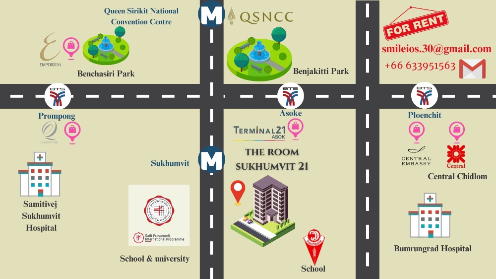 - 4 minutes from Subway (MRT Sukhumvit) & Skytrain (BTS Asoke) - 2 Schools nearby; SPIP and Wattana Wittaya Academy - 2 Hospital nearby; Bumrungrad Hospital & Samitivej Sukhumvit Hospital - 2