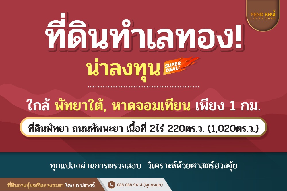 🔥🔥 #ที่ดินทำเลทอง! น่าลงทุน 🔥🔥 🚩 พิกัดซอยทัพพะยา 15 ขนาด 2 ไร่ 2งาน 20 ตรวา (1,020 ตร.วา) ราคา 80 ล้านบาท ค่าโอนคนละครั้ง . 📍 ห่างพัทยาใต้ เพียง 1 กม. 📍 ห่างหาดจอมเทียน เพียง 1 กม. 📍 ห่างเขาพระตำหนัก เพียง 1 กม. 📍 ใกล้แหล่งท่องเทียว CAFE ดังๆ มากมาย อาทิเช่น Chocolate Factory, 3 Mermaids, Oxygen, Sky Gallery 📍 ที่ดินใกล้เซนทรัลพัทยาเพียง 4 กม. 📍 ที่ดินเหมาะสำหรับทำ รีสอร์ต ทำหมู่บ้าน ทำ pool villa 📍 ทำโรงแรม ทำคอนโด บริเวณนั้นส่วนใหญ่เป็น รีสอร์ต เป็น Pool Villa เป็นคอนโด ทำคอนโดมองเห็นทะเล ค่ะ ‼️ ขนาด 36 x 100 เมตร ราคา 80 ล้านบาท ค่าโอนคนละครึ่ง ทำเลดีเยี่ยม เหมาะสำหรับนักลงทุน สนใจติดต่อ คลิกเพื่อดูเบอร์โทรติดต่อ เหม่ย พิกัด https://goo.gl/maps/mMCAQ8BB61MZhz7j7 Land for sales. The best location for investors. Urgent!!!! Land in Pattaya near the beach only 1.9 km. , 2-2-20 rai. Only 80 Millions Baht (50% for transfer fee). Landscape: 36x100 M. Landing suite for building resort, pool villas, condominiums, hotels and restaurants etc. 📍 Only 1 km. to South Pattaya 📍 Only 1 km. to Jomtien Beach 📍 Near Chocolate Factory, 3 Mermaids, Oxygen, Sky Gallery etc. 📍 Only 4 km. to Central Pattaya Interested please contact at คลิกเพื่อดูเบอร์โทรติดต่อ Mei Location: https://goo.gl/maps/mMCAQ8BB61MZhz7j7