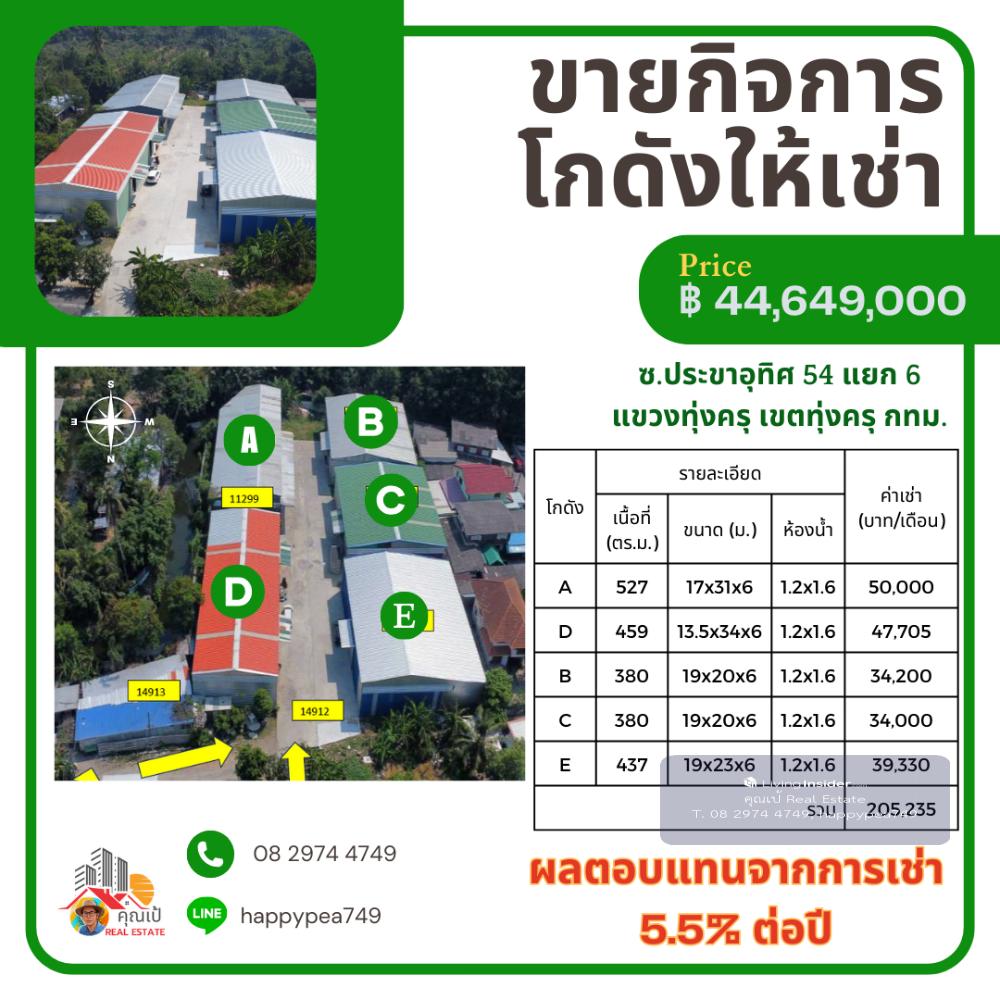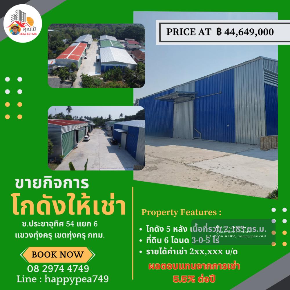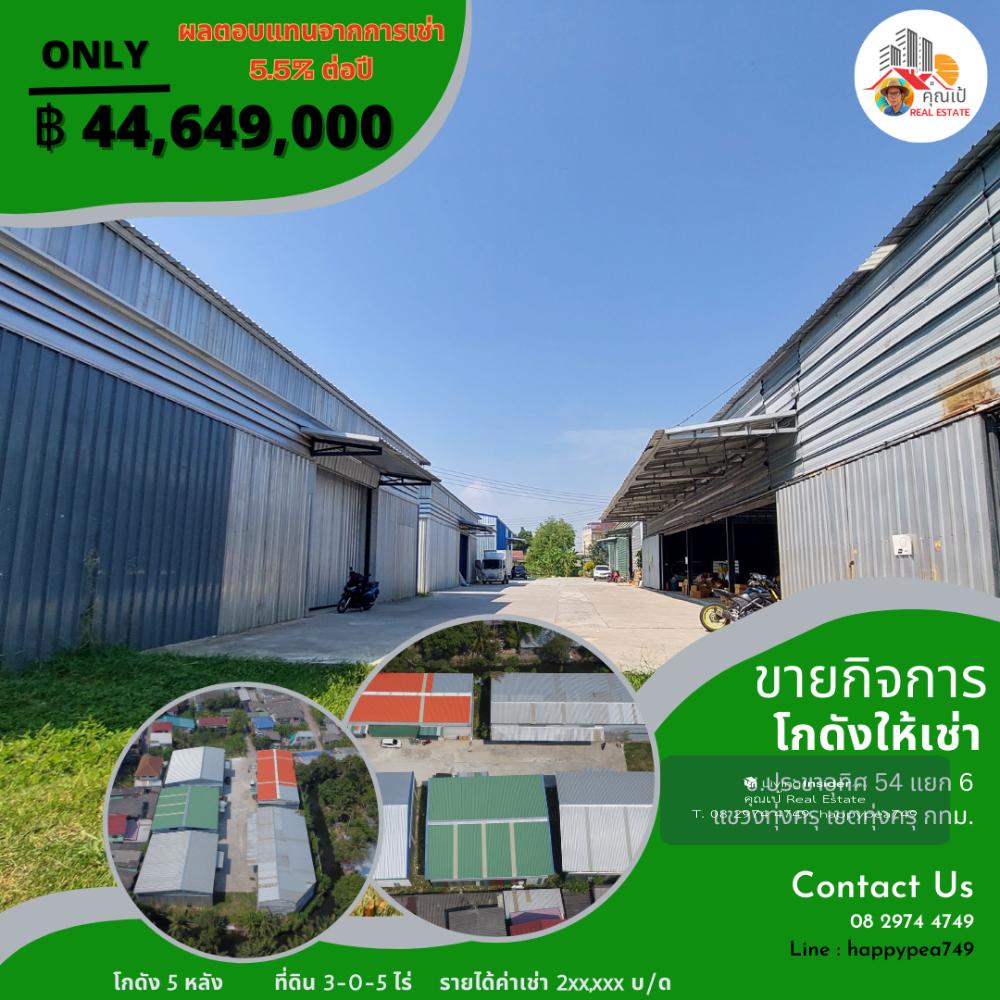 การลงทุนทำโกดังเช่าเพื่อการพาณิชย์ค้าขาย-การขนส่ง logistic กำลังเป็นที่นิยม เพราะธุรกิจออนไลน์มีแนวโน้มเจริญเติบโต หากคุณกำลังมองหาธุรกิจนี้ และต้องการประกอบกิจการได้ทันที ไม่ต้องเริ่มจากศูนย์ ต้องไม่พลาด!!! เรามีกิจการโกดังพร้อมที่ดิน ทำเลสมบูรณ์แบบสำหรับความต้องการทางธุรกิจของคุณ! ในราคาที่คุ้มค่าที่สุด 🔹 โกดังที่กว้างขวางและได้รับการดูแลอย่างดีจากเราซึ่งเป็นโรงงานผู้ผลิต 🔹 ตั้งอยู่ในทำเลที่สะดวก ใกล้เขตอุตสาหกรรมที่สำคัญ เข้าถึงทางหลวง ทางด่วนสายหลักได้ง่าย 🔹 พื้นที่จอดรถกว้างขวางสำหรับรถบรรทุกและยานพาหนะ 🔹 เหมาะสำหรับอุตสาหกรรมต่างๆ เช่น การผลิต การจัดเก็บ หรือการจัดจำหน่าย 🔹 บริเวณใกล้เคียงกำลังจะมีการเวนคืนที่ดินเพื่อตัดถนน 4 เลน โครงการถนนตามแนวผังเมือง ฉ1 และ ง21 เชื่อมถนนเพชรเกษมและถนนสุขสวัสดิ์และสายเชื่อมระหว่างถนนดังกล่าวกับถนนกาญจนาภิเษก ก็จะทำให้การเดินทางสะดวกยิ่งขึ้น และที่ดินมีราคาสูงขึ้น (ปัจจุบันประกาศ พรฎ.กำหนดแนวเขตเวนคืนที่ดินแล้ว) สามารถติดตามต่อได้ที่ : https://www.dailynews.co.th/news/2441929/ ทำเลโครงการ HS21 ของ Happy Warehouse ซ.ประขาอุทิศ 54 แยก 6 แขวงทุ่งครุ เขตทุ่งครุ กรุงเทพมหานคร 10140 https://goo.gl/maps/uS1HgXkCf2PaYBJo6 รายการโกดังให้เช่า 5 หลัง HS21-A โกดังให้เช่า ขนาด 527 ตร.ม. ค่าเช่า ฿50,000.00/ต่อเดือน HS21-B โกดังให้เช่า ขนาด 380 ตร.ม. ค่าเช่า ฿34,200.00/ต่อเดือน HS21-C โกดังให้เช่า ขนาด 380 ตร.ม. ค่าเช่า ฿34,000.00/ต่อเดือน HS21-D โกดังให้เช่า ขนาด 459 ตร.ม. ค่าเช่า ฿47,705.00/ต่อเดือน HS21-E โกดังให้เช่า ขนาด 437 ตร.ม. ค่าเช่า ฿39,330.00/ต่อเดือน รวมรายได้ค่าเช่า 205,235 บาท/เดือน *** ผลตอบแทนจากการเช่า 5.5%ต่อปี *** มากกว่าฝากดอกเบี้ยธนาคาร โกดัง จำนวน 5 หลัง รวมเนื้อที่ 2,183 ตารางเมตร รายการที่ดิน โฉนดครุฑแดง จำนวน 6 โฉนด รวมเนื้อที่ 3 ไร่ 0 งาน 5 ตารางวา (1,205 ตารางวา) ราคาขายทั้งโครงการ 44.649 ล้านบาท ค่าโอนกรรมสิทธิ์ คนละครึ่ง ติดต่อด่วน 🤵🏻คุณเป้ Real Estate 🏕ที่ดินสวย เพื่อการลงทุนและอยู่อาศัย ☎️ คลิกเพื่อดูเบอร์โทรติดต่อ ♥Line : happypea749 คลิก https://line.me/ti/p/WbmkWfUuvu 🌍ดูที่ดินแปลงอื่นๆ🌍 https://www.livinginsider.com/public_profile/1/eDbjy.html #โกดังเช่า #ขายธุรกิจ #ขายกิจการ #คลังสินค้า #โกดังให้เช่า #พุทธบูชา #ประชาอุทิศ #happyfranchise #warehouse #happywarehouse