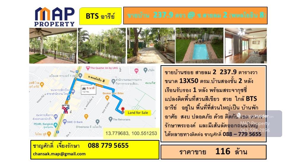 ขายบ้านซอย สายลม 2 237.9 ตารางวา ขนาด 13X50 ตรม.บ้านสองชั้น 2 หลัง เรือนรับรอง 1 หลังพร้อมสระจากุชชี่ แปลงติดพื้นที่สวนสีเขียว สวย ใกล้ BTS อารีย์ อยู่ใน พื้นที่ที่ส่วนใหญ่เป็น บ้านพักอาศัย สงบ ปลอดภัย ด้วย ติดกับ เขต ทหารรักษาพระองค์ และมีเส้นลัดออกถนนใหญ่ได้หลายทาง Contact Agent : คุณชาญศักดิ์ 088.779.5655 Addline : https://line.me/ti/p/hIQ_UdzHL9