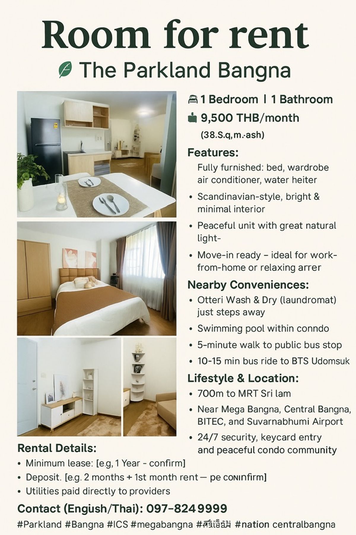 Parkland บางนา 38 ตรม 1 ห้องนอน ตกแต่งสไตล์มินิมอล เฟอร์นิเจอร์ แอร์ใหม่ ห้องน่าอยู่ มุมนั่งเล่น มุมรับประทานอาหาร สวนกว้างใหญ่ บรรยากาดี น่าอยู่สุดๆ ของกินมากมาย เดินถึงรถไฟฟ้าสีเหลือง (ศรีเอี่ยม) สนใจจองโทร คลิกเพื่อดูเบอร์โทรติดต่อ -ตู้เย็น -เครื่องซักผ้า -เครื่องทำน้ำอุ่น -สะอาด -สบาย และสะดวก -สวนใหญ่สุดในบางนา -สระว่ายน้ำ -ที่จอดรถส่วนกลาง -รปภ.24 ชั่วโมง สวนกว้างใหญ่สุด ในบางนา อาหารการกินสะดวก Food Garage ร้านอาหารญี่ปุ่น SEVEN ELEVEN 2 จุด TOP SUPERMARKET หลัง Index Living Mall ส่วนกลางสะดวกสบาย สวนใหญ่ สระว่ายน้ำใหญ่ สนามบาสเกตบอลเพิ่มความสนุกสนานยามว่างให้กับสมาชิกในครอบครัว Parkland บางนา 38 ตรม 1 ห้องนอน ตกแต่งสไตล์มินิมอล เฟอร์นิเจอร์ แอร ห้องน่าอยู่ มุมนั่งเล่น มุมรับประทานอาหาร สวนกว้างใหญ่ บรรยากาศดี น่าอยู่สุดๆ ของกินมากมาย เดินถึงรถไฟฟ้าสีเหลือง (ศรีเอี่ยม) สนใจจองโทร คลิกเพื่อดูเบอร์โทรติดต่อ -ตู้เย็น -เครื่องซักผ้า -ไมโครเวฟ -เครื่องทำน้ำอุ่น