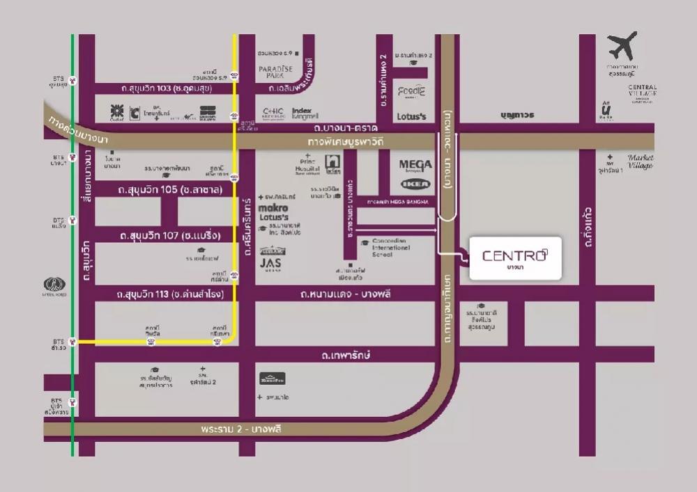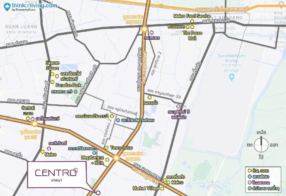 ทำเล : ตั้งอยู่ห่างจากถนนบางนา – ตราดประมาณ 2 กิโลเมตร เชื่อมต่อกับทางด่วนได้ถึง 2 สาย ทั้งถนนวงแหวนกาญจนาภิเษก และทางพิเศษบูรพาวิถี เข้า – ออกเมืองได้ง่าย มีตัวเลือกเป็นรถไฟฟ้าสายสีเหลือง (สถานีศรีด่าน) ให้เลือกใช้ในการเดินทาง โครงการจัดอยู่ในย่านที่มีความอุดมสมบูรณ์สูง สามารถขับรถไป MEGA บางนาได้ในระยะแค่ 1 กิโลเมตรเท่านั้นค่ะ บ้านเดี่ยวซีรี่ส์ใหม่ : รูปแบบบ้านสไตล์ Modern เหมาะกับคนที่ชอบความเรียบง่ายแต่ดูทันสมัย เมื่อเทียบกับโครงการ CENTRO ในย่านเดียวกัน ซีรีส์นี้ก็ถือว่าเปิดตัวครั้งแรกในย่านบางนาเลย โดยรูปแบบบ้านมีให้เลือกถึง 5 แบบ พื้นที่ใช้สอย 164-289 ตร.ม. ส่วนกลางกว่า 5 ไร่ : CENTRO บางนา จัดเป็นโครงการแนวราบขนาดค่อนข้างใหญ่ โดยมีจำนวนเพื่อนบ้านถึง7 382 ยูนิต ปัจจุบันได้แบ่งเป็นเฟส 1 และเฟส 2 (พื้นที่ในอนาคต) สำหรับพื้นที่ส่วนกลางเพื่อความสะดวกของลูกบ้าน โครงการจึงได้แยกพื้นที่ส่วนกลางออกเป็น 2 จุด เพื่อรองรับการใช้งานได้ทั้ง 2 เฟส รวมกันแล้วได้พื้นที่กว่า 5 ไร่ เหมาะสำหรับคนที่ชอบส่วนกลางใหญ่ๆสามารถออกมาใช้ทำกิจกรรมนอกบ้านได้เยอะค่ะ พิกัด Google Maps : 13.632374, 100.675698 CENTRO บางนา เป็นโครงการใหม่จาก AP ทำเลตั้งอยู่บนถนนสาธารณะ ซึ่งเป็นถนนที่อยู่ใต้ถนนกาญจนาภิเษก ลักษณะเป็นถนนกว้าง 2 เลน รถสามารถขับสวนเข้า – ออกกันได้อย่างสะดวก การเข้าถึงโครงการจะใช้ถนนบางนา – ตราดเป็นหลัก ซึ่งอยู่ห่างจากทางเข้าประมาณ 2 กิโลเมตร โดยจุดเด่นของโครงการอยู่ที่ทำเล นอกจากจะอยู่ใกล้แหล่งความอุดมสมบูรณ์สูงแล้ว ยังสามารถเดินทางเข้า – ออกเมืองได้ง่าย ใกล้ทางด่วนถึง 2 สาย คือ ทางพิเศษบูรพาวิถี และทางด่วนกาญจนาภิเษก จึงถือว่าเหมาะมากกับคนที่ใช้รถส่วนตัวในการเดินทางเป็นหลัก ส่วนการเดินทางด้วยรถสาธารณะ โครงการอยู่ห่างจากรถไฟฟ้าสายสีเหลืองประมาณ 6.9 กิโลเมตร สถานีที่ใกล้ที่สุดคือสถานีศรีลาซาล สำหรับใครที่อยากเลี่ยงการจราจรติดขัดในย่านนี้ รถไฟฟ้าก็ถือเป็นอีกตัวเลือกในการเดินทางเข้าเมืองที่น่าสนใจนะคะ โครงการ CENTRO บางนา เป็นโครงการบ้านเดี่ยวในราคาถูก ซึ่งก็ถือว่าเปิดตัวมาใกล้เคียงกับโครงการในละแวกเดียวกัน แต่มีจุดเด่นอยู่ที่ความอุดมสมบูรณ์ เพราะโครงการอยู่ห่างจาก MEGA บางนา เพียง 1 กิโลเมตร สำหรับคนที่ชอบความสะดวกสบาย อยากอยู่ใกล้แหล่งช็อปปิ้ง ออกมาจับจ่ายซื้อของได้ง่าย ไม่ต้องฝ่ารถติด โครงการนี้ก็ถือว่าตอบโจทย์ทีเดียวค่ะ นอกจากนี้โครงการยังอยู่ใกล้กับโรงเรียนชื่อดังหลายแห่ง ซึ่งก็มีทั้งชั้นอนุบาลไปจนถึงชั้นมัธยม ใกล้ที่สุดคือ Concordian International 