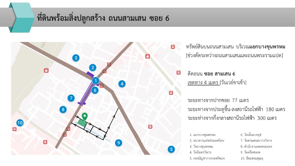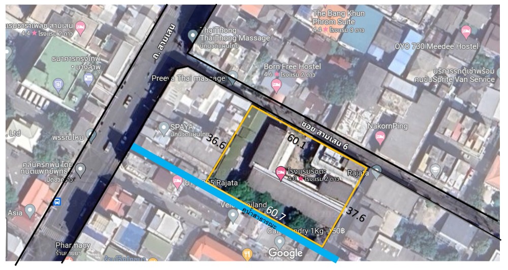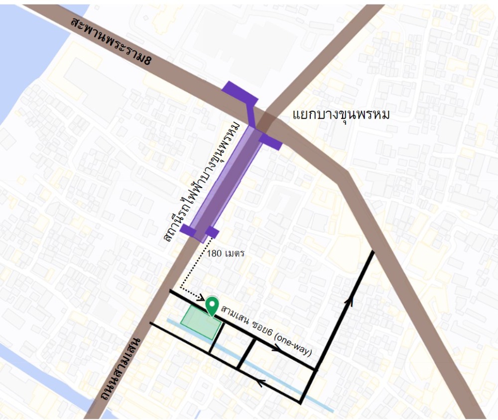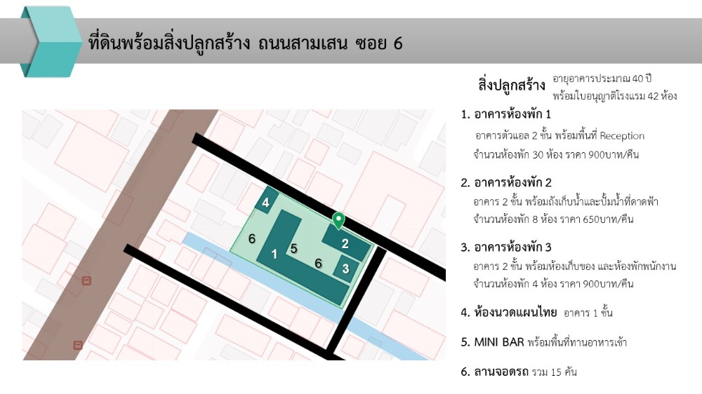 ขายที่ดินพร้อมสิ่งปลูกสร้าง ถนนสามเสน ซอย 6 แยกบางขุนพรหม ระยะทางจากปากซอย 77 เมตร ระยะทางจากประตูขึ้น-ลงสถานีรถไฟฟ้า สถานีบางขุนพรหม 180 เมตร ที่ดิน 1-1-50 ไร่ หน้ากว้าง 60 เมตร ติดถนนสามเสน ซอย 6 เขตทาง 4 เมตร , ความลึก 36 เมตร ด้านหลัง ติดคูน้ำสาธารณะ ผังเมือง สีแดง พ7-14 FAR 7:1 OSR 4.5% ถนนเขตทาง 4 เมตร [สร้างอาคารพื้นที่รวมไม่เกิน 2,000 ตารางเมตร ต่อ 1 อาคาร แต่ละอาคารสูงได้ไม่เกิน 15 เมตร มีที่จอดรถรวมกันต้องไม่เกิน 15 คัน] พร้อมสิ่งปลูกสร้าง 3 อาคารหลัก ห้องพัก 42 ห้อง ที่จอดรถ 15 คัน ราคา 365,000 บาท ต่อ ตารางวา ทั้งหมด 200,000,000 บาท ติดต่อ บิ๋ม คลิกเพื่อดูเบอร์โทรติดต่อ