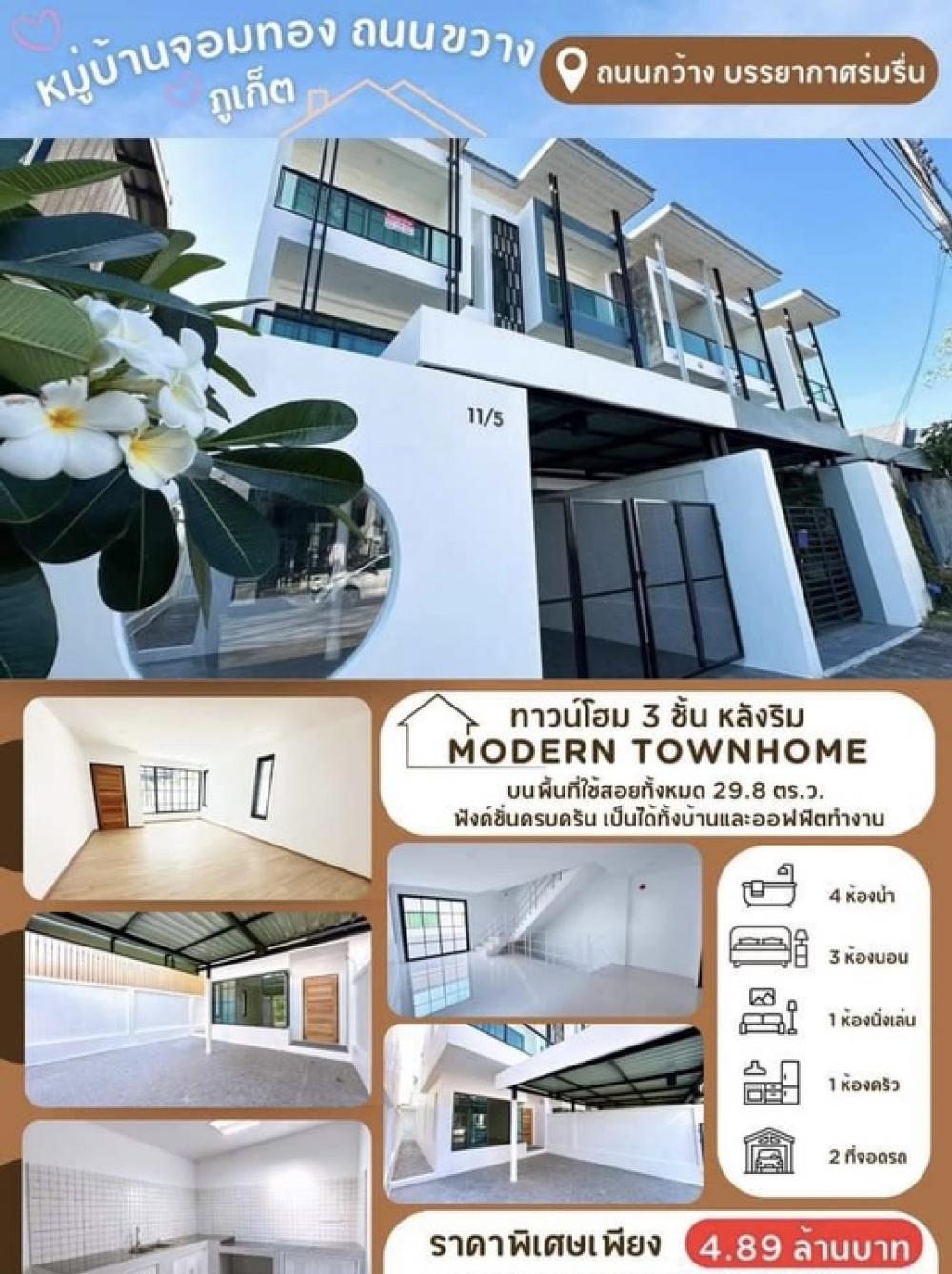 หมู่บ้านจอมทองถนนขวาง จ.ภูเก็ต ถนนกว้างบรรยากาศร่มรื่น ทาวน์โฮม 3ชั้น หลังริม สไตล์โมเดิร์น บนพื้นที่ใช้สอยทั้งหมด 29.8 ตรว. ฟังชั่นครบครันเป็นได้ทั้งบ้านและออฟฟิศ ราคาพิเศษเพียง 4.89 ลบ.