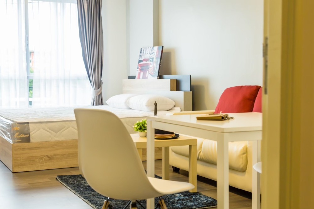 ห้อง studio 1ห้องนอน 1ห้องน้ำ ขนาด 30.05 ตร.ม. อาคารE (อาคารใหม่สุด)ชั้น 3 วิวเมือง เฟอร์นิเจอร์ครบ ลากกระเป๋าเข้าอยู่ได้เลย ห้องแบ่งพื้นป็นสัดส่วนชัดเจน ห้องครัว ห้องไม่ร้อน มีผ้าม่าน2ชั้น (ผ้าโปร่ง+