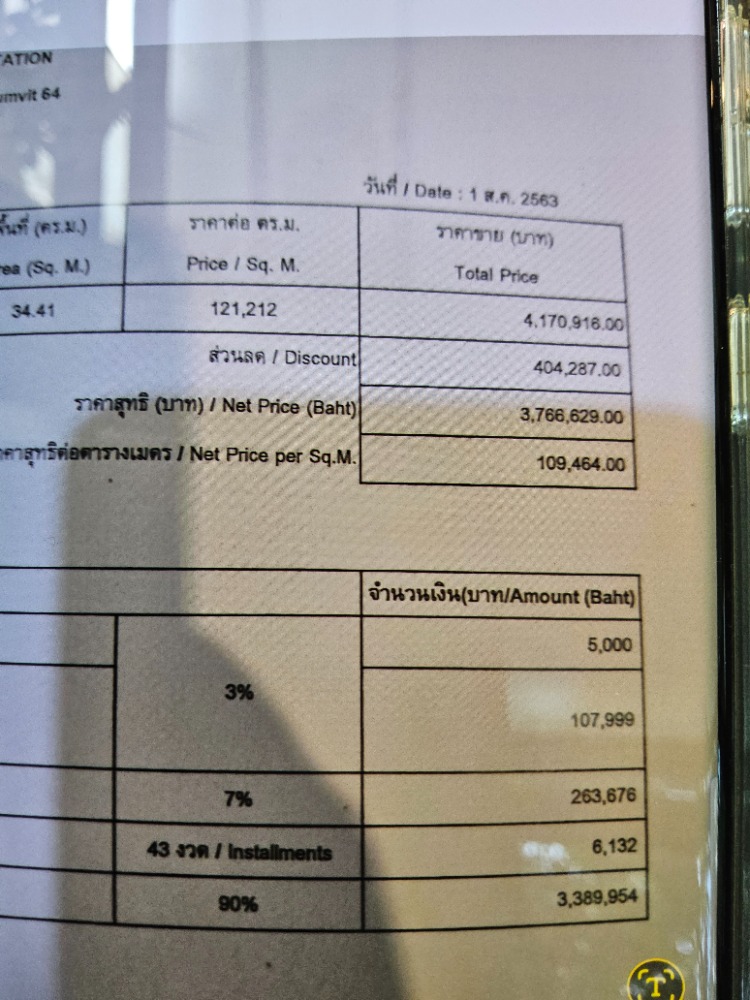 ชั้น35 วิวทิศเห็นแม่น้ำไม่โดนบลอควิว ราคาตอนพรีเซลมีส่วนลดสี่แสน ราคาเต็ม 4,170,916 หลังหักส่วนลด 3,766,629 ตกตารางเมตรละ 109k ตอนนี้ตึกใหม่ของโครงการเริ่มที่120k ดาวน์และทำสัญญาไปแล้ว 376k เหลือเข้าแบงค์ 3,389,954 ขายขาดทุน 50,000 เหลือ 326,000 ไม่มีค่าเปลี่ยนสัญญา สนใจโทร หรือ add line คลิกเพื่อดูเบอร์โทรติดต่อ line id chu.wasana