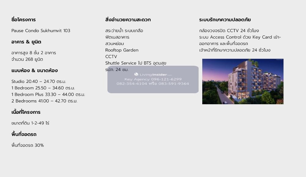 โครงการ Pause สุขุมวิท 103 คอนโด low-rise สูง 8 ชั้น 2 อาคาร (Origin) เพียง 800 เมตรถึง BTS อุดมสุข มีหลายยูนิตที่ลดราคาพิเศษให้เลือก รายละเอียดทรัพย์: ขนาด 2 ห้องนอน 2 ห้องน้ำ (อ่างอาบน้ำห้องนอนใหญ่) พื้นที่ 44.23 ตร.ม. ชั้น 3 อาคาร B ห้องมุม โซนห้องครัว + ห้องนั่งเล่น แอร์ 3 ตัว "เหมาะสำหรับคนที่อาศัยหรือทำงานในพื้นที่อุดมสุข-ลาซาล-แบริ่งอยู่แล้ว มีรถใช้ส่วนตัวบ้าง หรือเดินทางด้วยรถไฟฟ้าโดยพึ่งพา Shuttle Service ของโครงการ อยู่ไม่ไกลจากสถานีราคาสบายกระเป๋าห้องพร้อมเข้าอยู่" พื้นที่ส่วนกลาง สวนหย่อมรอบโครงการ สระว่ายน้ำ อ่างจากุชชี่ Sky Fitness ห้องอ่านหนังสือ สวนลอยฟ้า พื้นที่บาร์บีคิว shuttle bus สำหรับ BTS CCTV/Access Card พื้นที่จอดรถ 35% รวมซ้อนคัน นใจนัดชมห้อง หรือ สอบถามเพิ่มเติม ติดต่อ Line @270wmhmk หรือ คลิกเพื่อดูเบอร์โทรติดต่อ (คิม) บริการฟรีทุกขั้นตอน ONE STOP SERVICE ฟรีบริการ pre-approved และ ยื่นสินเชื่อกับธนาคารเกือบทุกธนาคาร ด้วยประสบการณ์การทำงานมาอย่างยาวนาน และมืออาชีพ เราจะเป็นที่ปรึกษาให้คุณทุกขั้นตอน หมดปัญหากวนใจ จนถึงวันโอนที่ สนง.ที่ดิน