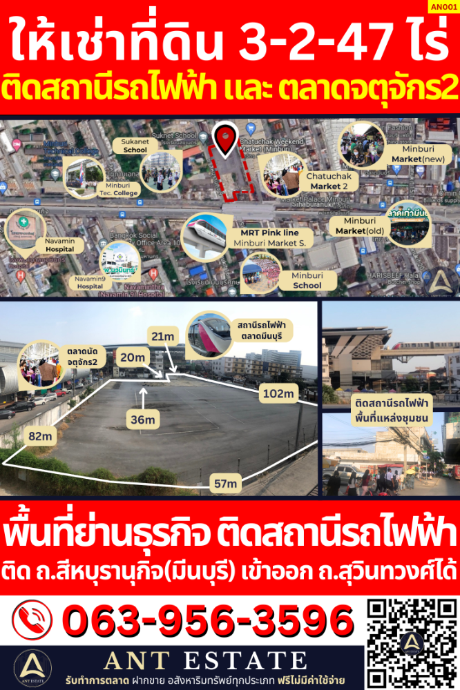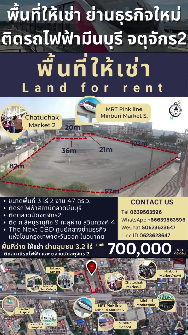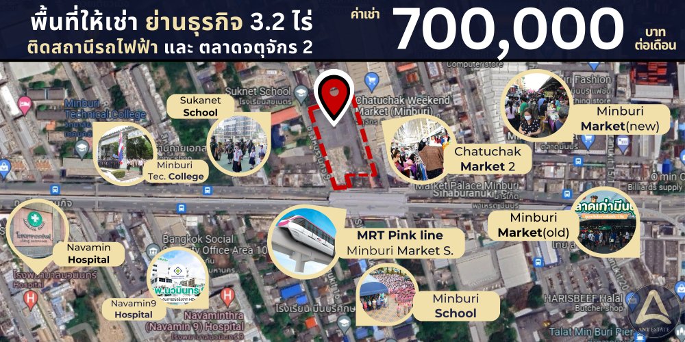พื้นที่ให้เช่าทำเลทอง ย่านธุรกิจใหม่ ติดสถานีรถไฟฟ้า ติดตลาดนัดจตุจักร 2 อยู่แหล่งชุมชน เดินทางสะดวก ใกล้สถานพยาบาล สถานศึกษา โรงงาน บริษัท และ แหล่งที่พักอาศัย คอนโด อพาร์ทเม้นท์ ===================== รหัสทรัพย์: AN001 ===================== ลักษณะพื้นที่ -ขนาดพื้นที่ 3 ไร่ 2 งาน 47 ตร.ว. -ติด สถานีรถไฟฟ้าสายสีชมพู สถานีตลาดมีนบุรี -ติด ถ.สีหบุรานุกิจ ซอย 9 สามารถทะลุผ่าน ถ.สุวินทวงส์ ซอย 4 -อยู่ในพื้นที่ผังเมืองสีแดงย่านธุรกิจ ===================== ลักษณะเด่น ทรัพย์ตั้งอยู่ศูนย์กลางแหล่งความชุมชน คมนาคมสะดวก รายล้อมไปด้วยสถานที่ต่างๆมากมาย อาทิ เช่น - คอนโด อพาร์ทเม้นท์ หอพัก กว่า 20 แห่ง (ภายในรัศมี 3 กม.) เช่น The Cube Plus, The All 24 Luxury Residence, เดอะไดมอนด์ 789, โชคธนชัยคอนโดมิเนียม, MINI PRs Hostel, เป็นต้น - ศูนย์การค้า กว่า 10 แห่ง (ภายในรัศมี 3 กม.) เช่น ตลาดนัดจตุจักร2, ตลาดมีนบุรีใหม่, ตลาดมีนบุรีเก่า, Big C, Lotus, Mega Home, Market Palace Minburi, ไทวัสดุ เป็นต้น - สถานศึกษา กว่า 10 แห่ง (ภายในรัศมี 4 กม.) เช่น มหาวิทยาลัยเกษมบัณฑิต, วิทยาลัยเทคนิคมีนบุรี, ร.ร.เศรษฐบุตรบำเพ็ญ, รร.สารสาสน์, รร.อินเตอร์คิดส์, รร.สุขเนตร เป็นต้น - โรงงาน/บริษัท ขนาดใหญ่และกลาง กว่า 20 แห่ง (ภายในรัศมี 4 กม.) เช่น โรงงาน/บริษัทเครือยูเนี่ยน, โรงงานอาหารยอดคุณ, บจก.ว.ศิริกาญออโตพาร์ท, ศูนย์ซ่อมบำรุงรถไฟฟ้าสีชมพู, ศูนย์อะไหล่อีซูซุ เป็นต้น - สถานพยาบาลกว่า 3 แห่ง (ภายในรัศมี 3 กม.) เช่น โรงพยาบาลนวมินทร์9, โรงพยาบาลนวมินทร์, โรงพยาบาลเสรีรักษ์ - การคมนาคม ติดรถไฟฟ้าสถานีตลาดมีนบุรี, ติดถนนใหญ่ ถ.สีหบุรานุกิจ ซอย9 สามารถทะลุ สุวินทวงศ์ ซอย 4, ติดอู่รถตู้มีนบุรี-ฉะเชิงเทรา, ใกล้อู่รถตู้มีนบุรี-อนุสาวรีย์ชัยสมรภูมิ และ อยู่ใกล้ 4 แยกมีนบุรี ===================== เหมาะสำหรับ - พัฒนา Community mall - พัฒนา Co-Working Space - พัฒนา Market Place - พัฒนา ศูนย์กลางค้า - พัฒนา อาคารสำนักงาน Office - พัฒนา ร้านอาหาร ร้านค้า - พัฒนา สถานที่รับรองการจัดงาน event ต่างๆ - พัฒนา คอนโดแบบเช่าระยะยาว ===================== ค่าเช่า 700,000 บาทต่อเดือน *เช่าระยะยาว 5 ปีขึ้นไป ===================== สนใจติดต่อ โทร คลิกเพื่อดูเบอร์โทรติดต่อ Line ID: คลิกเพื่อดูเบอร์โทรติดต่อ Wechat: S คลิกเพื่อดูเบอร์โทรติดต่อ WhatsApp: คลิกเพื่อดูเบอร์โทรติดต่อ Inbox: http://m.me/AntEstateEastBKK https://sites.google.com/view/antestate-th