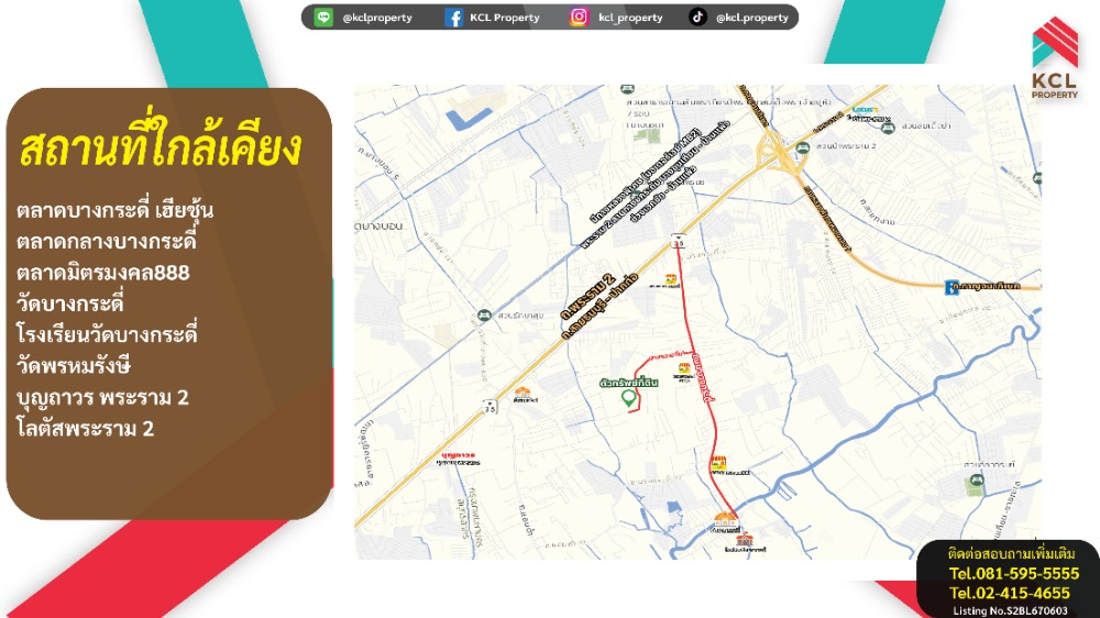 พร้อมใบรง. 2 ไม่ต้องเสียเวลาสร้างใหม่ ใช้งานได้ทันที พื้นที่แบ่งเป็น 4 ส่วนพื้นที่ใช้สอยรวม 2,970 ตารางเมตร ดังนี้ ส่วนที่ 1 ตัวโรงงานหลัก พื้นที่ขนาด 36 X 55 พื้นที่ใช้สอย 1,724 ตารางเมตร – จากหลังคาถึงพื้นตัวโรงงานสูง 11 เมตร โปร่งโล่งสบาย – หลังคาเมทัลชีท สลับหลังคาโปร่งแสง เพิ่มประสิทธิภาพให้โรงงานสว่างมากขึ้น ทำให้ประหยัดค่าไฟฟ้า – โรงงานส่วนขยายที่ 1 ขนาด 8 X 55 พื้นที่ใช้สอย 440 ตารางเมตร – โรงงานส่วนขยายที่ 2 ขนาด 10 X 50 พื้นที่ใช้สอย 500 ตารางเมตร ส่วนที่ 2 สำนักงาน 2 ชั้น ขนาด 16 X 16 X 2 พื้นที่ใช้สอย 512 ตารางเมตร สภาพดพร้อมใช้งาน – เฟอร์นิเจอร์บิวท์อิน ปูกระเบื้องเต็มพื้นที่ทุกชั้น พร้อมห้องผู้บริหาร,ห้องนอน แอร์ติดเพดาน ส่วนกลาง จำนวน 2 ตัว – ห้องเก็บเอกสาร ขนาด 4 X 16 พื้นที่ใช้สอย 64 ตารางเมตร ส่วนที่ 3 บ้านพักคนงาน 2 ตึก รวม 56 ห้อง – ตึกที่1 5 ห้องใหญ่ ห้องน้ำในตัว 2 ห้อง ห้องน้ำรวม 1 ห้อง – ตึกที่2 51 ห้อง ห้องน้ำ 6 ห้องและ บ่ออาบน้ำ 1 บ่อ – แต่ละห้องมีมิเตอร์ไฟฟ้าแยกออกจากกันสามารถควบคุมและคิดค่าใช้จ่ายได้ง่าย ส่วนที่ 4 ที่ดินเปล่าถมแล้ว ขนาดประมาน 83 x 63 เมตร – ถมดินไว้เรียบร้อย ปรับพื้นไว้แล้ว พร้อมขยายและใช้ประโยชน์เพิ่มได้ทันที เข้า-ออกสะดวกหลายเส้นทางทั้ง ถนนแสมดำ,ถนนเทียนทะเล,ถนนเลียบทางด่วนวงแหวนตะวันตก เป็นต้น ราคา 120,000,000 บาท สอบถามรายละเอียดเพิ่มเติมได้ที่ คุณเค้ก Tel. คลิกเพื่อดูเบอร์โทรติดต่อ หรือ คลิกเพื่อดูเบอร์โทรติดต่อ Line: @kclproperty