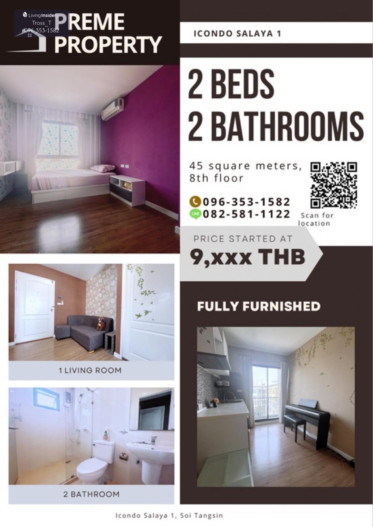 iCondo Salaya - ไอคอนโด ศาลายา 2 ห้องนอน 2 ห้องน้ำ *** สนใจติดต่อสอบถามข้อมูลเพิ่มเติม Line ID / Tel : peerawattros, คลิกเพื่อดูเบอร์โทรติดต่อ ⭐️เครื่องซักผ้า ที่จอดรถในร่ม ⭐️ตึก A ชั้น 8 ขนาด 45 ตรม. ⭐️ห้องแบบ 2 ห้องนอร 2 ห้องน้ำ 🛎️พร้อมอยู่เลย 🛎️เครื่องใช้ไฟฟ้า แอร์ 3 เครื่อง ตู้เย็น 1 เครื่องทำน้ำอุ่น 2 เครื่องซักผ้า 1 อยู่ใกล้ 7-11 Big C Mini Lotus Express ตลาดใหม่ศาลายา : 1 กม. Makro ศาลายา : 1 กม. รพ.ศาลายา : 1.6 กม. ม.เทคโนโลยีราชมงคลรัตนโกสินทร์ : 1.9 กม. ม.มหิดล : 1 กม. รร.มหิดลวิทยานุสรณ์ : 1.2 กม. **ค่าส่วนกลางคนละครึ่ง ⭐️ถูกใจสามารถวางจองได้⭐️ ❤️สอบถามได้เลย❤️ ➖➖➖➖➖➖➖➖➖➖➖➖➖➖ ☎️ ติดต่อ : คลิกเพื่อดูเบอร์โทรติดต่อ พลอย