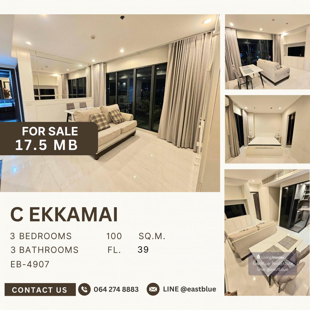 Project : C Ekkamai ID : EB-4907JM 3 Bed 3 Baht Size :100 sqm Selling Price : 14,500,000 - Contact, Appointment for viewing. Line: @eastblue / https://lin.ee/yNwHbFs WhatsApp: คลิกเพื่อดูเบอร์โทรติดต่