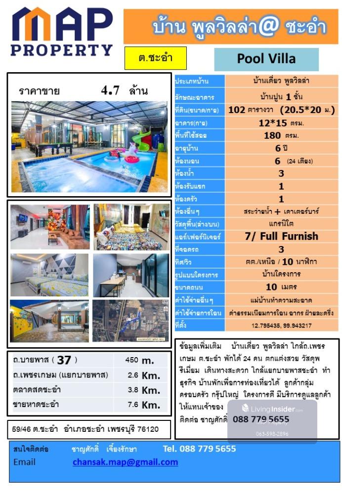 ขายพูลวิลล่า 24 เตียง ชะอำ บ้านเดี่ยว พูลวิลล่า 102ตารางวา ใกล้ถ.เพชรเกษม ต.ชะอำ พักได้ 24 คน 6ห้องนอน 3 ห้องน้ำ ตกแต่งสวย แอร์ 7 ตัว เฟอร์นิเจอร์ครบ เปิดรับลูกค้าได้เลย เดินทางสะดวก ใกล้แยกบายพาสชะอำ