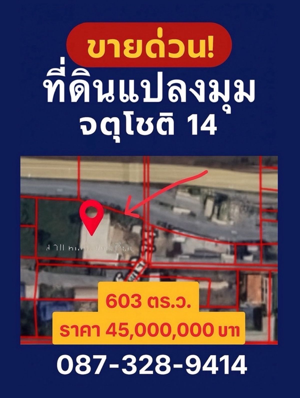 ขายด่วน ที่ดินแปลงมุม ซอย จตุโชติ 14 สายไหม กรุงเทพฯ เนื้อที่ 603 ตร.ว. ราคา 45,000,000 บาท (เจ้าของขายเอง) ที่ตั้ง : แขวงออเงิน เขตสายไหม กรุงเทพมหานคร สนใจโทร คลิกเพื่อดูเบอร์โทรติดต่อ