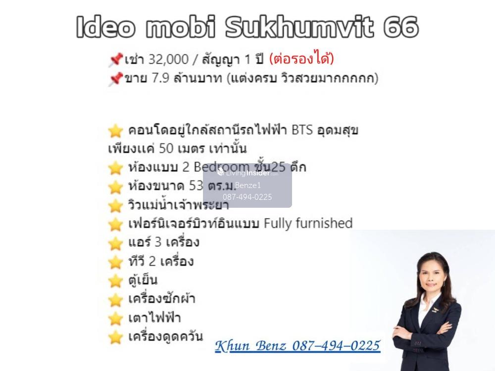 ให้เช่า ไอดีโอ โมบิ สุขุมวิท 66 คอนโดวิวสูง ห้องสวย 2 bed ใกล้สถานีรถไฟฟ้าBTS อุดมสุข เพียง 50 เมตร วิวโค้งแม่น้ำเจ้าพระยา https://youtu.be/xc8fabdHt6A?si=Vb8xEg4B3gAE2RbG ที่ตั้ง ซอย สุขุมวิท 66 บางนาเหนือ เขตบางนา กรุงเทพมหานคร 10260 Location : https://maps.app.goo.gl/6s7Vsu5QtbQQA6xo6 ขาย / เช่า คอนโดไอดีโอ โมบิ สุขุมวิท66 ราคาเช่า 32,000 บาท /เดือน (ต่อรองได้ถึง 30,000) สัญญาเช่า 1 ปี ราคาขาย 7.9 ล้านบาท / ค่าโอนคนละครึ่ง - ชั้น25 ห้องใหม่ ไม่เคยเข้าอยู่ วิวสวย - ห้องแบบ 2 Bedroom - 2 ห้องน้ำ - ขนาด 53 ตร.ม. เฟอร์นิเจอร์ครบพร้อมใช้งาน - เฟอร์นิเจอร์บิวท์อินทั้งห้อง ผนังหินอ่อนแท้ - แอร์ 3 เครื่อง - ทีวี 2 เครื่อง - ตู้เย็น - เตาไฟฟ้า เครื่องดูดควัน - เครื่องซักผ้า สิ่งอำนวยความสะดวกในโครงการ - ฟิตเนส ชั้น 28 - พื้นที่นั่งเล่น พักผ่อน วิวสวย ชั้น 27 - สระว่ายน้ำระบบเกลือยาว 20 ม. ชั้น 27 สถานที่ใกล้เคียง เซนทรัลบางนา ไบเทคบางนา ตึกทรูดิจิตอล Please Contact : Khun Benz ♦️ Mobile : คลิกเพื่อดูเบอร์โทรติดต่อ ♦️ Mobile : คลิกเพื่อดูเบอร์โทรติดต่อ E-mail: คลิกเพื่อดูอีเมล _______________________ บริการด้านอสังหาริมทรัพย์ ขาย-ซื้อ-เช่า-พร้อมให้คำปรึกษาด้านสินเชื่อ _______________________