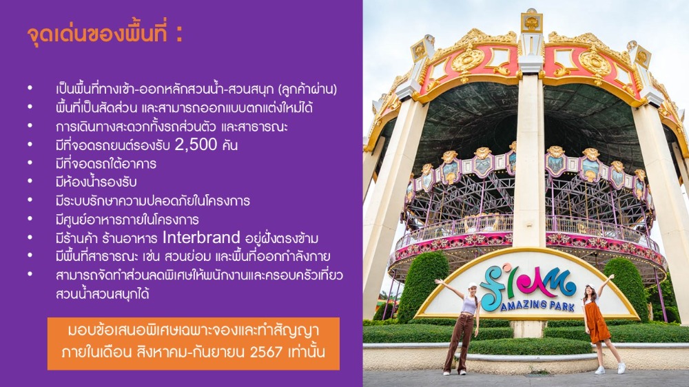 สวนสยาม ทะเล-กรุงเทพฯ เปิดให้พื้นที่ สำหรับผู้ที่สนใจทำออฟฟิศ ร้านค้า คลินิก หรือโรงเรียนกวดวิชา พร้อมตัวเลือกการเช่าที่ยืดหยุ่น สัมผัสกับสิ่งอำนวยความสะดวกชั้นเยี่ยม พร้อมที่จอดรถกว่า 2,500 คัน ร้านอาหารดัง KFC คาเฟ่ starbucks และใกล้สถานี BTS สายสีชมพู สถานี นพรัตน์ สะดวกต่อการเดินทาง รายละเอียดพื้นที่ : 1. อาคาร AMAZING Hall 2. ชั้น 1 (ด้านล่าง) 3. ขนาดพื้นที่ 216.06 ตรม. 4. ราคา 250 บาทต่อ ตรม. (เฉพาะจองและทำสัญญา สิงหาคม-กันยายน 2567) 5. ประกันพื้นที่ 2 เดือนล่วงหน้า (ได้รับคืนเมื่อส่งคืนพื้นที่สมบูรณ์) 6. ค่าเช่าล่วงหน้า 3 เดือน 7. เป็นพื้นที่หลักที่ผู้ใช้บริการ สวนน้ำ-สวนสนุก เข้าและออกทางเดียว ทั้งวัน 8. ชั้น 2 ด้านบนเป็น ออฟฟิตพนักงานของทางสวนสยาม 200 คน 9. พื้นที่ส่วนนี้เป็นพื้นที่เข้าฟรี ลูกค้าทั่วไปสามารถเข้าได้ฟรี **ใกล้สถานที่สำคัญ:** 1. แฟชั่นไอส์แลนด์ (ศูนย์การค้า) 2. เดอะ พรอมานาด (คอมมูนิตี้มอลล์) 3. ตลาดน้ำขวัญเรียม 4. จตุจักร 2 (เจเจ กรีน 2) 5. Bangkok Arena 6. โรงพยาบาลนพรัตนราชธานี 7. โรงพยาบาลสินแพทย์ 8. โรงพยาบาลเปาโล นวมินทร์ 9. เดอะมอลล์ บางกะปิ (ศูนย์การค้า) 10. อมอรินี่ รามอินทรา (คอมมูนิตี้มอลล์) ทำเลทองสำหรับธุรกิจของคุณ! สำหรับรายละเอียดเพิ่มเติมและจองพื้นที่ ติดต่อเราผ่าน Tel. / Line : คลิกเพื่อดูเบอร์โทรติดต่อ คุณเมนี่