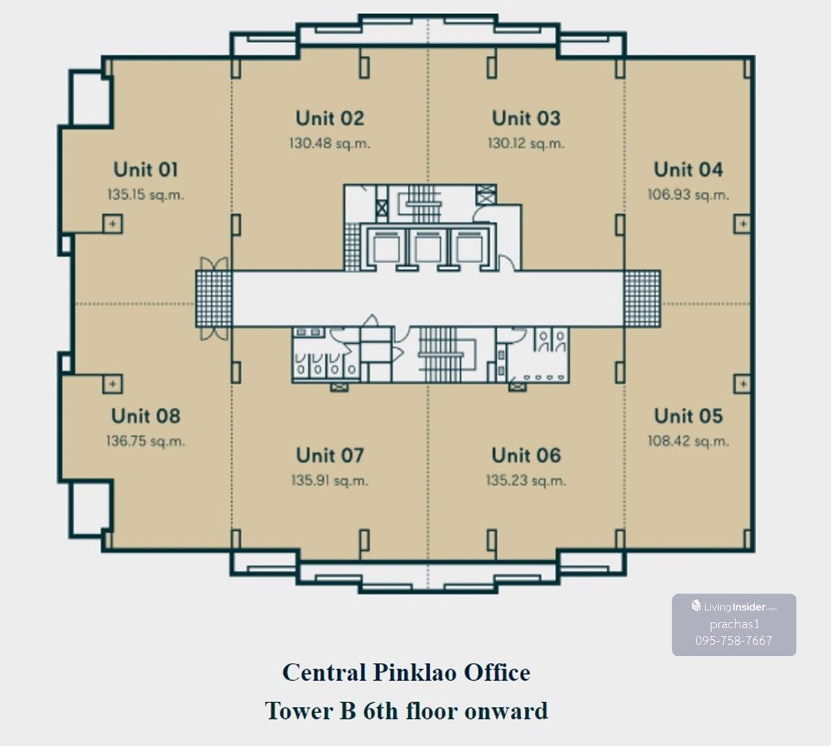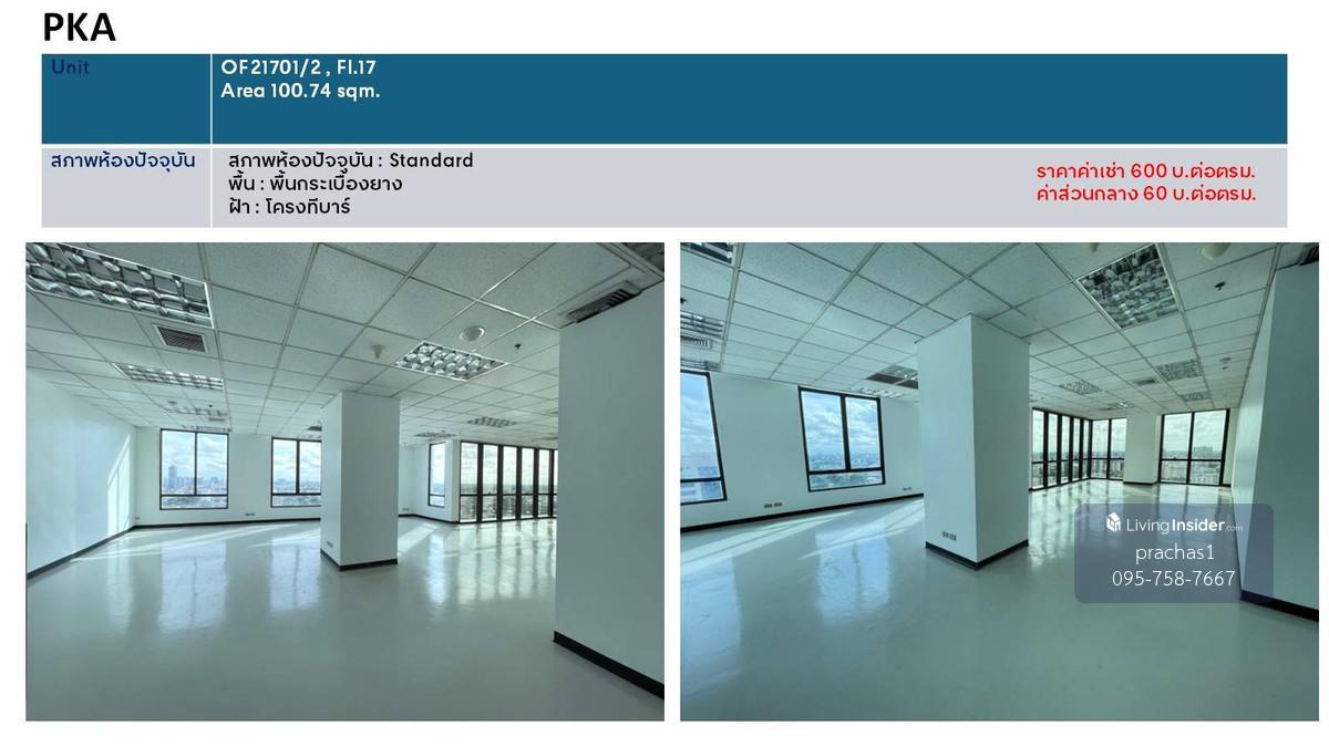 ให้เช่า พื้นที่สำนักงานเซ็นทรัล ปิ่นเกล้า Central Pinklao Office Tower สำนักงานออฟฟิศให้เช่าย่านปิ่นเกล้า ติดถนนบรมราชชนนี บางกอกน้อย กรุงเทพฯ ค่าเช่าเริ่ม ตร.ม.ละ 600 บาท*/เดือน ค่าส่วนกลาง ตร.ม.ละ 60 บาท*/เดือน สัญญาเช่า 3 ปี พื้นที่สำนักงาน Tower A (Standard) ชั้น 17 เนื้อที่ 100.74 ตร.ม. ค่าเข่าเดือนละ 60,444 บาท ระยะเวลา 3 ปี ชั้น 17 เนื้อที่ 122.49 ตร.ม. ค่าเข่าเดือนละ 73,494 บาท ระยะเวลา 3 ปี - ค่าส่วนกลาง ตร.ม.ละ 60 บาท*/เดือน อาคารสำนักงานเซ็นทรัล ปิ่นเกล้า ประกอบด้วย 2 อาคาร ตั้งอยู่ในโครงการศูนย์การค้าเซ็นทรัล ปิ่นเกล้า ซึ่งมีร้านค้า ร้านอาหาร อำนวยความสะดวกมากมาย เหมาะเช่าทำสำนักงาน สถาบันการศึกษา คลินิก เวลเนส เป็นต้น อาคารสำนักงานเซ็นทรัล ปิ่นเกล้า (Central Pinklao Office Tower) ประกอบด้วย Tower A 23 ชั้น,Tower B 15 ชั้น ตั้งอยู่ที่ 7/222 ถนนบรมราชชนนี แขวงอรุณอมรินทร์ เขตบางกอกน้อย กรุงเทพมหานคร 10700.\ พื้นที่สำนักงานว่างให้เช่า - ขนาดตั้งแต่ 85.15 - 312.52 ตร.ม. - ราคาค่าเช่าสำนักงาน ุ600 - 1,000 บาท*/ตร.ม./เดือน เงื่อนไขการเช่า - สัญญาเช่า 3 ปี - เงินประกันการเช่าพื้นที่สำนักงาน 4 เดือน - ค่าเช่าล่วงหน้า 1 เดือน ค่าที่จอดรถ - ที่จอดรถฟรี 1 คัน / พื้นที่ 100 ตร.ม. สถานที่ใกล้เคียง : เมเจอร์ ซีนีเพล็กซ์ ปิ่นเกล้า, ห้างพาต้า ปิ่นเกล้า, โรงพยาบาลศิริราช ปิยมหาราชการุณย์, โรงพยาบาลเจ้าพระยา, สะพานพระราม 8, สนามหลวง, ถนนข้าวสาร *เงื่อนไขเป็นไปตามท่ี่บริษัทกำหนด ติดต่อสอบถาม Tel. คลิกเพื่อดูเบอร์โทรติดต่อ