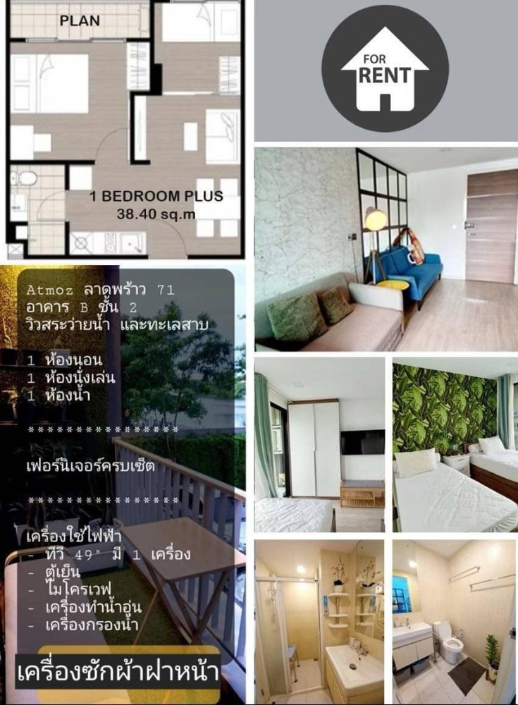 FOR RENT Atmoz Ladprao 71 Size : 38.40 Sq.m Floor : 2 Building B Type : 2 Bed 1 Bath Fully furnished Rental Price : 15,000 ฿ The Walk เกษตร - นวมินทร์ Contact 🚨💬 @001quhdo https://lin.ee/BxUHLiY K.Hugo (ฮิวโก้) ☎️ คลิกเพื่อดูเบอร์โทรติดต่อ K.Minnie ☎️ คลิกเพื่อดูเบอร์โทรติดต่อ
