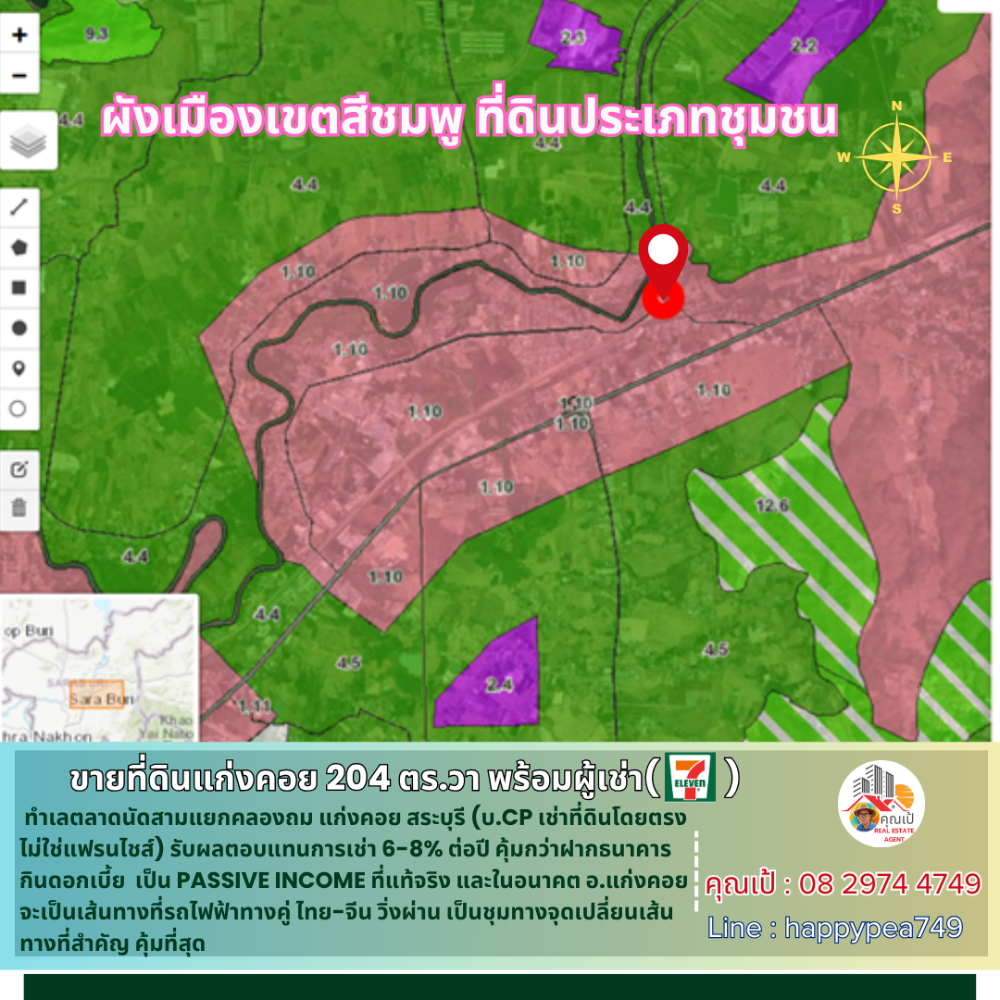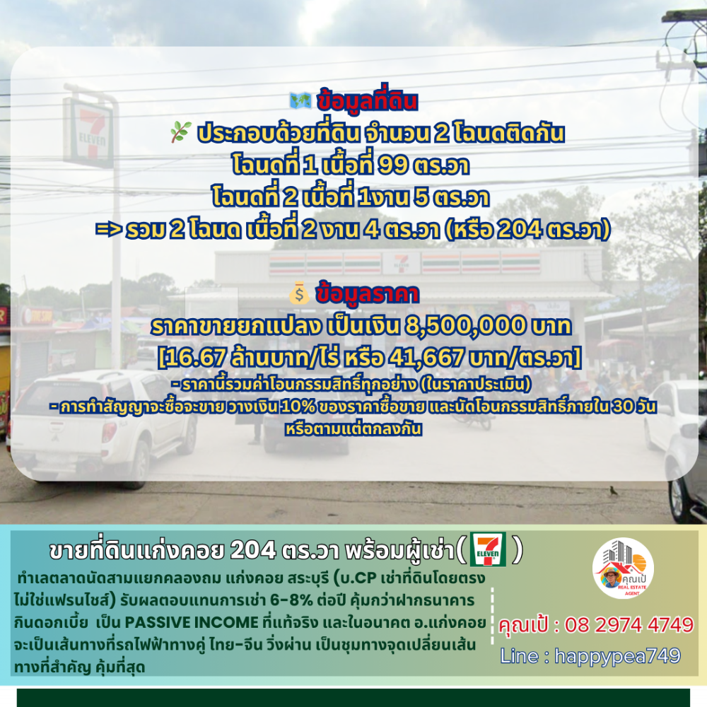 [ขายแล้ว] ***ใครที่สนใจ ที่ดินพร้อมผู้เช่าที่เป็นร้านสะดวกซื้อ แบบนี้ แอดไลน์ happypea749 สอบถามได้เลยครับ**** ======================================== 💰 ที่ดินในตลาดนัดสามแยกคลองถม แก่งคอย อ.แก่งคอย จ.สระบุรี ขนาด 204 ตร.วา ทำเลดีมาก ขายพร้อมผู้เช่า ร้าน 7-11 (ของ บ.CP โดยตรง ไม่ใช่ร้านแฟรนไชส์) สัญญาระยะยาวถึงปี 2584 เป็นอย่างน้อย ผมคำนวณดูแล้ว ได้ผลตอบแทน 6-8% ต่อปีเลย คุ้มกว่าฝากธนาคารกินดอกเบี้ย ชนะเงินเฟ้อ เป็น PASSIVE INCOME ที่แท้จริง และเรื่องทำเลในอนาคต อ.แก่งคอย จะเป็นเส้นทางที่รถไฟฟ้าทางคู่ ไทย-จีน วิ่งผ่านเป็นชุมทางจุดเปลี่ยนเส้นทางอีกด้วย ส่วนท่านที่กังวลว่า CP จะยกเลิกการเช่าก่อนนั้น เนื่องจากอีกมุมหนึ่งมีร้านสะดวกซื้ออีกรายที่เป็นคู่แข่งเปิดอยู่ CP จึงไม่ยกเลิกสัญญาก่อนแน่นอน 🚧 ที่ตั้ง ตำบล บ้านป่า อำเภอแก่งคอย จังหวัดสระบุรี 18110 📍การปักหมุดนำทาง https://maps.app.goo.gl/E9fy2ZbiBmBBSSnE9 📍 สถานที่สำคัญใกล้เคียง - โรงไฟฟ้าแก่งคอย 2 2.8 ก.ม. 6 นาที - ถนนมิตรภาพ 5 ก.ม. 10 นาที - โรงปูน SCG แก่งคอย 8.1 ก.ม. 12 นาที - โรงปูนนครหลวง(อินทรี) 11.5 ก.ม. 19 นาที - โรงพยาบาลแก่งคอย 7.2 ก.ม. 14 นาที - โรบินสัน สระบุรี 16.3 ก.ม. 24 นาที - แม็คโคร สระบุรี 14 ก.ม. 24 นาที - โรงพยาบาล สระบุรี 18.7 ก.ม. 29 นาที - ศาลากลาง จ.สระบุรี 20 ก.ม. 26 นาที 🧶 ผังเมืองเขตสีชมพู ที่ดินประเภทชุมชน ให้ใช้ประโยชน์ที่ดินเพื่อการอยู่อาศัย พาณิชยกรรม เกษตรกรรม สถาบันการศึกษา สถาบันศาสนา สถาบันราชการ การสาธารณูปโภคและสาธารณูปการ 🗺️ ข้อมูลที่ดิน 🌿 ประกอบด้วยที่ดิน จำนวน 2 โฉนดติดกัน โฉนดที่ 1 เนื้อที่ 99 ตร.วา (ราคาประเมินที่ดิน 1,500 บาท/ตร.วา) โฉนดที่ 2 เนื้อที่ 1งาน 5 ตร.วา (ราคาประเมินที่ดิน 6,000 บาท/ตร.วา) => รวม 2 โฉนด เนื้อที่ 2 งาน 4 ตร.วา (หรือ 204 ตร.วา) 💰 ข้อมูลราคา ราคาขายยกแปลง เป็นเงิน 8,500,000 บาท [16.67 ล้านบาท/ไร่ หรือ 41,667 บาท/ตร.วา] - ราคานี้รวมค่าโอนกรรมสิทธิ์ทุกอย่าง (ในราคาประเมิน) - การทำสัญญาจะซื้อจะขาย วางเงิน 10% ของราคาซื้อขาย และนัดโอนกรรมสิทธิ์ภายใน 30 วัน หรือตามแต่ตกลงกัน 🌟 แอดไลน์ผมด้านล่าง เพื่อรับไฟล์เอกสารเสนอขาย สำหรับอ่านรายละเอียด และสัญญาเช่าได้เลยครับ 📢สอบถามรายละเอียดเพิ่มเติม ติดต่อ 🤵คุณเป้ Real Estate Agent รับฝาก ซื้อ-ขาย ที่ดินสวย เพื่อการลงทุน ธุรกิจ และอยู่อาศัย 📞Tel. คลิกเพื่อดูเบอร์โทรติดต่อ 📟 Line : happypea749 คลิก https://line.me/ti/p/WbmkWfUuvu 🎉ดูที่ดินแปลงอื่นๆ https://www.livinginsider.com/public_profile/1/eDbjy.html #ชุมทางแก่งคอย #ที่ดินแก่งคอย #ที่ดินสระบุรี #ร้านสะดวกซื้อ #ร้าน7eleven #แก่งคอย #CPALL #ที่ดินพร้อมผู้เช่า #ตลาดนัดสามแยกคลองถมแก่งคอย #711 #passiveincome