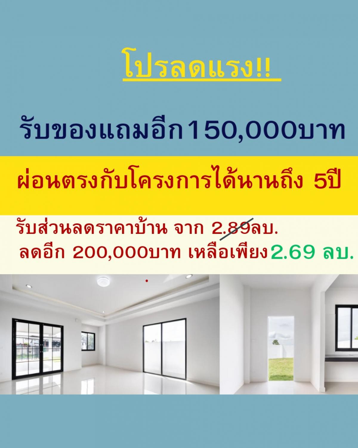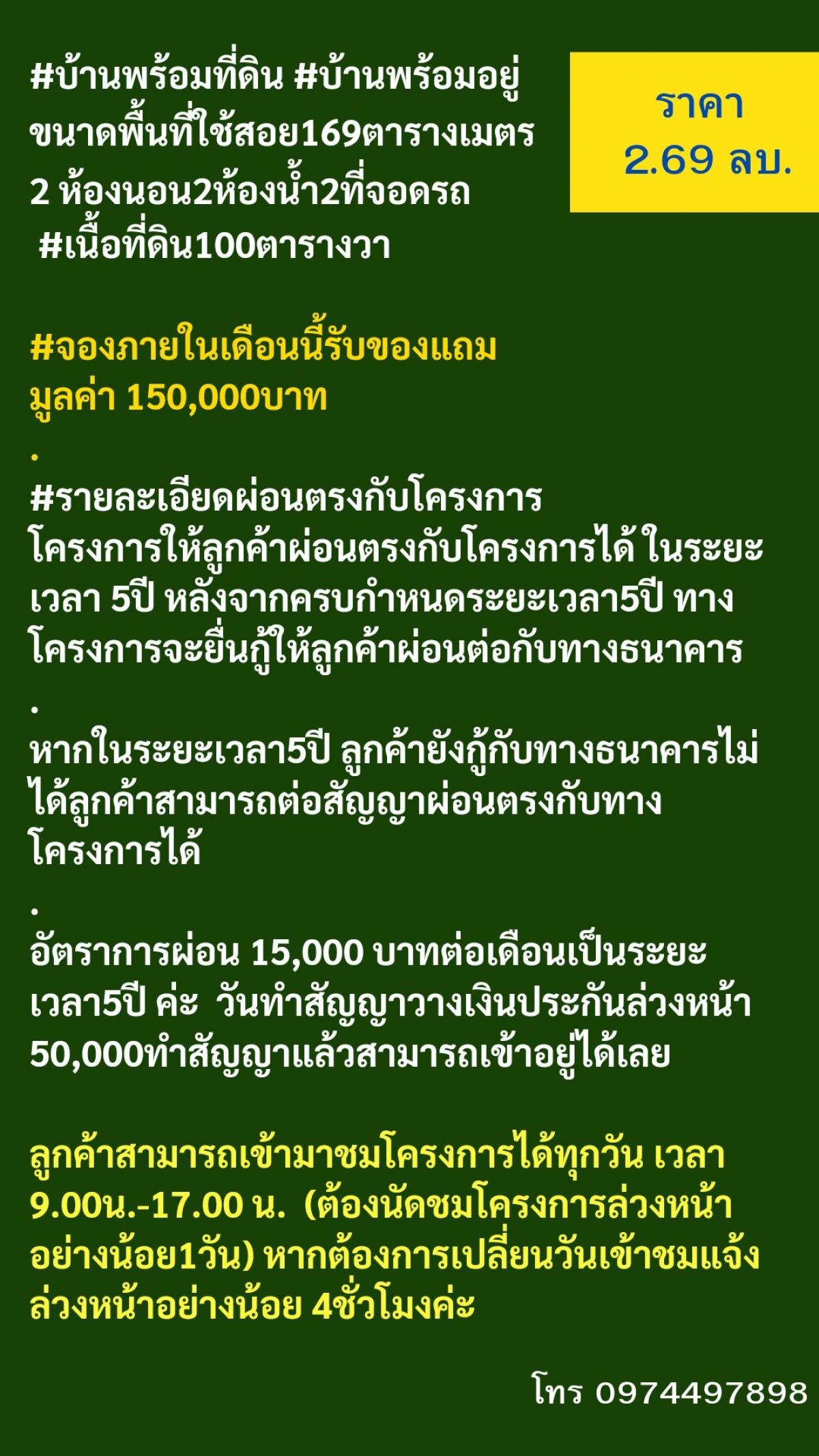 #บ้านไม่ต้องกู้อยู่ได้เลย ผ่อนตรงกับโครงการสบายๆเพียงเดือนละ 15,000 บาท ต่อเดือน ระยะเวลานานถึง5ปี #บ้านพร้อมอยู่ ขนาดพื้นที่ใช้สอย169ตรม. 2 ห้องนอน2ห้องน้ำ2ที่จอดรถ #เนื้อที่ดิน100ตรว. ราคา 2.69 ลบ. #จองภายในเดือนนี้รับของแถม มูลค่า 150,000บาท #รายละเอียดผ่อนตรงกับโครงการ โครงการให้ลูกค้าผ่อนตรงกับโครงการได้ ในระยะเวลา 5ปี หลังจากครบกำหนดระยะเวลา5ปี ทางโครงการจะยื่นกู้ให้ลูกค้าผ่อนต่อกับทางธนาคาร หากในระยะเวลา5ปี ลูกค้ายังกู้กับทางธนาคารไม่ได้ลูกค้าสามารถต่อสัญญาผ่อนตรงกับทางโครงการได้ เป็นการช่วยเหลือลูกค้าเบื้องต้น ในกรณีที่กู้ไม่ผ่านหรือเดินบัญชีไว้ ไม่สม่ำเสมอ หรือติดปัญหาด้านอื่นๆ อัตราการผ่อน 15,000 บาทต่อเดือนเป็นระยะเวลา5ปี ค่ะ วันทำสัญญาวางประกันล่วงหน้า 50,000ทำสัญญาแล้วสามารถเข้าอยู่ได้เลย ในระหว่างการผ่อนตรงมีเจ้าหน้าที่ฝ่ายสินเชื่อให้คำแนะนำเรื่องการเดินบัญชีเพื่อให้ลูกค้ากู้ธนาคารได้ ลูกค้าสามารถเข้ามาชมโครงการได้ทุกวัน เวลา 9.00น.-17.00 น. (ต้องนัดชมโครงการล่วงหน้าอย่างน้อย1วัน) หากต้องการเปลี่ยนวันเข้าชมแจ้งล่วงหน้าอย่างน้อย 4ชั่วโมงค่ะ #หากลูกค้าต้องการสอบถามรายละเอียดเพิ่ม โทร คลิกเพื่อดูเบอร์โทรติดต่อ