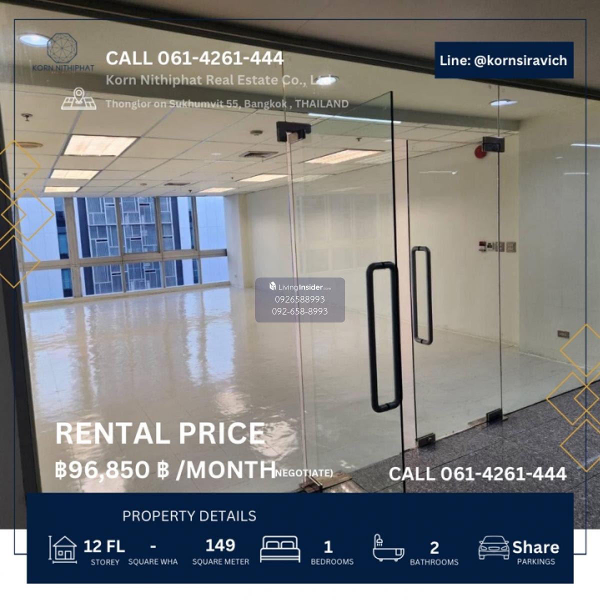 🔘 ให้เช่า ออฟฟิศ สำนักงาน จดบริษัท VAT ซอย ทองหล่อ สุขุมวิท 55 วัฒนา, กรุงเทพ __💥💥ค่าเช่า 96,850 บาท /เดือน💥💥__ Call คลิกเพื่อดูเบอร์โทรติดต่อ | 𝗟𝗶𝗻𝗲: @𝗸𝗼𝗿𝗻𝘀𝗶𝗿𝗮𝘃𝗶𝗰𝗵 ◻️▫️อสังหาริมทรัพย์ สำหรับ: ออฟฟิต, โฮมสตูดิโอ, Back officer, Marketing agency 🛍️ ออฟฟิศ สำนักงาน ขนาด 149 ตารางเมตร 🛍️ ชั้น 12 วิวทองหล่อ ใกล้ Khun By YOU TELA Thonglor และ Sumerset Thonglor 🛍️ เข้าออก 24 ชม., ตกแต่ง ทำห้องไลฟ์สดได้ 🛍️ เดินเท้า ไป รถไฟฟ้า BTS ทองหล่อ 🚉 🛍️ ค่าไฟ 7 บาท ค่าน้ำ 20 บาท 🛍️ ค่าแอร์คิดตามการใช้จริง 88 บาท /ชม. 🔘 สัญญาเช่า ขั้นต่ำ 3 ปี ประกัน 3 เดือน 🔘 เงินประกันตกแต่ง 50,000 บาท (ถ้ามี) 🔘 ค่าบำรุง 5,000 บาท จ่ายครั้งแรกครั้งเดียว 🔘 Internet TOT, 3BB ติดตั้งด้วยตนเอง 🔘 รปภ 24 ชม., CCTV, คาเฟ่, ร้านอาหาร 🌿Korn Nithiphat Real Estate Co., Ltd 🏡 🌿Call คลิกเพื่อดูเบอร์โทรติดต่อ Hot Line 🌿Call คลิกเพื่อดูเบอร์โทรติดต่อ Kong 🙋🏻♂️🤍 🌿Line Official Account: @kornsiravich 🌿Since 2020, Real Property Agent 🌱 🌿Invesment, Financial, Consulting